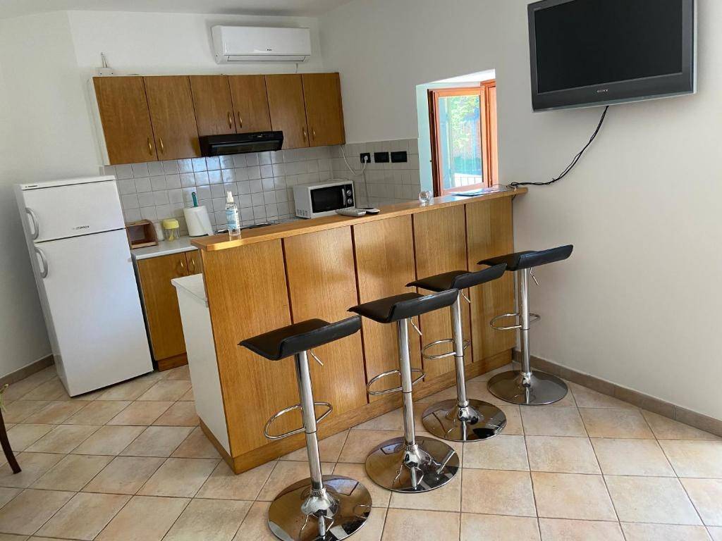 Kuća se prostire na tri etaže i obuhvaća dva potpuno opremljena apartmana. U prizemlju se nalazi jednosobni apartman koji uključuje spavaću sobu, kupaonicu, kuhinju i dnevni boravak s izlazom na prostranu terasu. S terase se pruža očaravajući, otvoreni pogled na more i obližnju lučicu – savršeno mjesto za opuštanje uz zvuk valova.