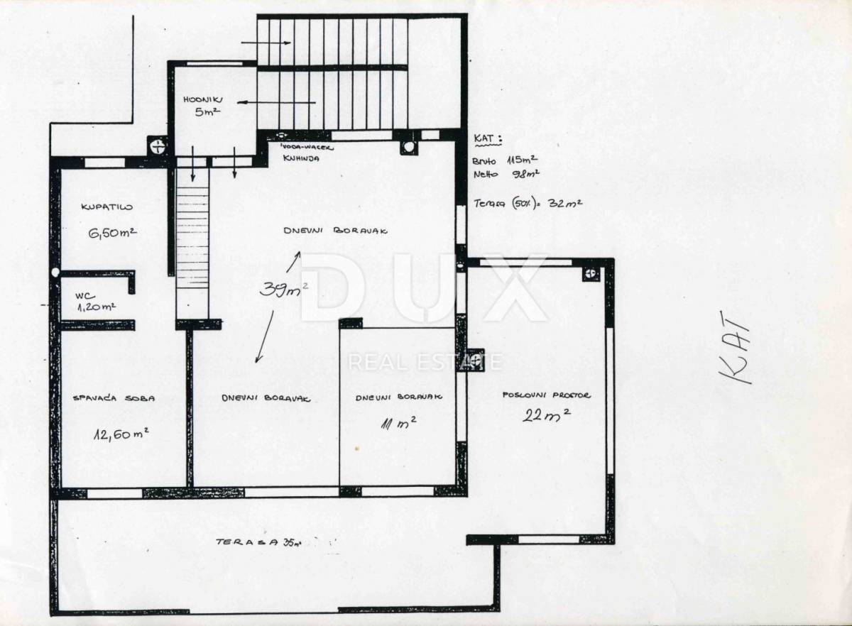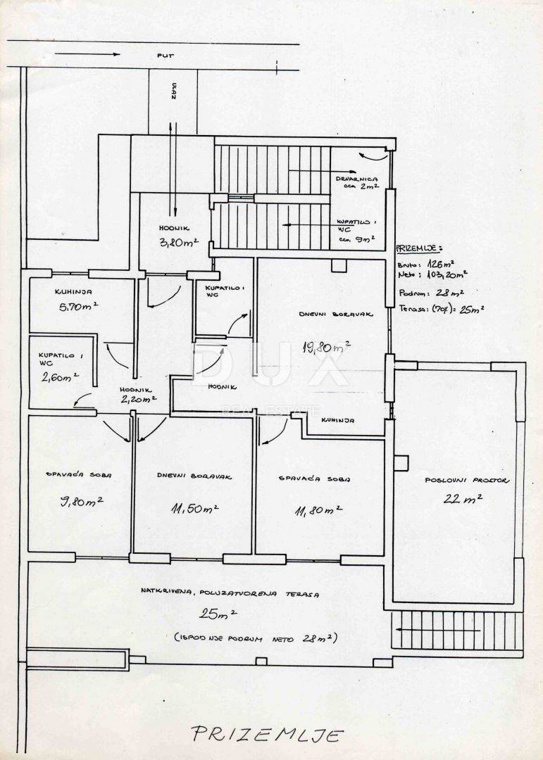 Podrum u funkciji radionice ima cca 30 m2. Prizemlje se sastoji od poslovnog prostora (22 m2), kotlovnice za centralno grijanje sa toaletom, ostave i dva apartmana sa odvojenim ulazima i zajedničkom natkrivenom terasom od 35 m2. Jedan apartman je u naravi 2S+DB dok je drugi 1S+DB. Na prvom katu se nalazi veliki stan od cca 100 m2 koji se sastoji od hodnika, toaleta, ostave, spavaće sobe, kupaonice, prostrane kuhinje sa blagovaonicom i iznimno velikog dnevnog boravka na dva nivoa iz kojeg se izlazi na natkrivenu terasu od 35 m2. Visoko potkovlje je stan od cca 80 m2 koji se satoji od kupaonice, dvije spavaće sobe, walk in garderobe i kuhinje sa blagovaonicom i dnevnim boravkom iz kojeg se izlazi na terasu od 18 m2.