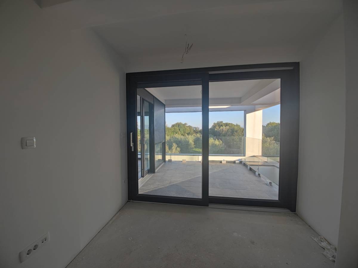 Prizemlje nudi otvoreni dnevni boravak s kuhinjom i blagovaonicom, jednu spavaću sobu i moderno uređenu kupaonicu. Iz dnevnog prostora izlazi se na natkrivenu terasu, savršenu za opuštanje uz bazen i sunčalište.
