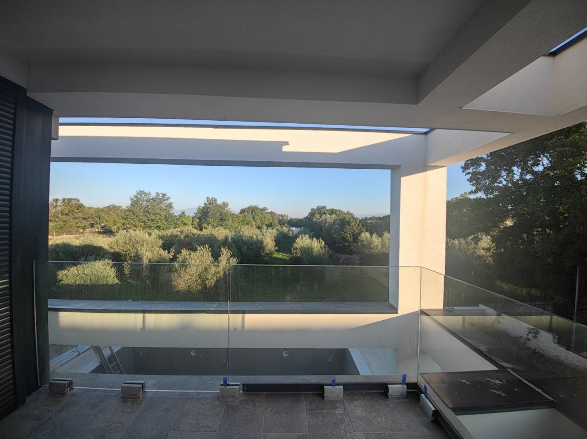 Kuća je građena vrhunskim materijalima: troslojna stakla, bambusov parket, kvalitetna keramika i inverter klime u svim prostorijama. Okućnica je pažljivo uređena, s bazenom, sunčalištem i dva parkirna mjesta.