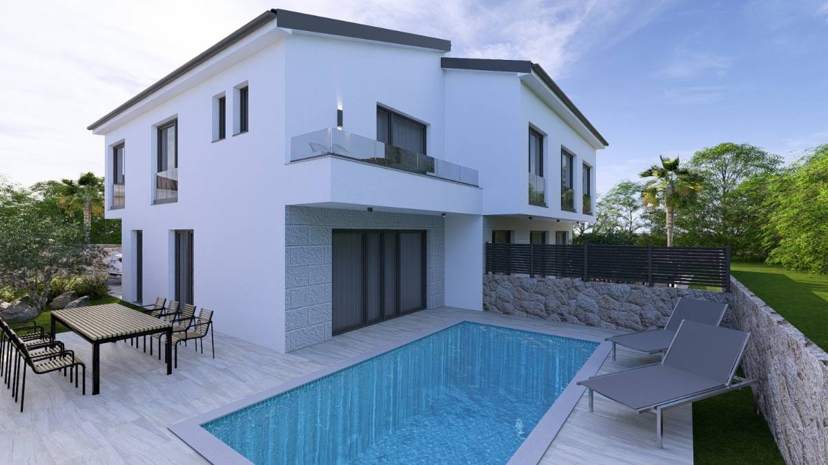 Ova moderna dvojna kuća na mirnoj lokaciji u blizini Malinske nudi savršen spoj funkcionalnosti i luksuza. Prizemlje vas vodi kroz ulazni hodnik u prostrani dnevni boravak, koji je povezan s blagovaonicom i kuhinjom. Na ovoj etaži nalazi se i gostinjski WC te natkrivena terasa s koje se pruža pogled na bazen i uređeni vrt, idealni za opuštanje i uživanje na otvorenom.
