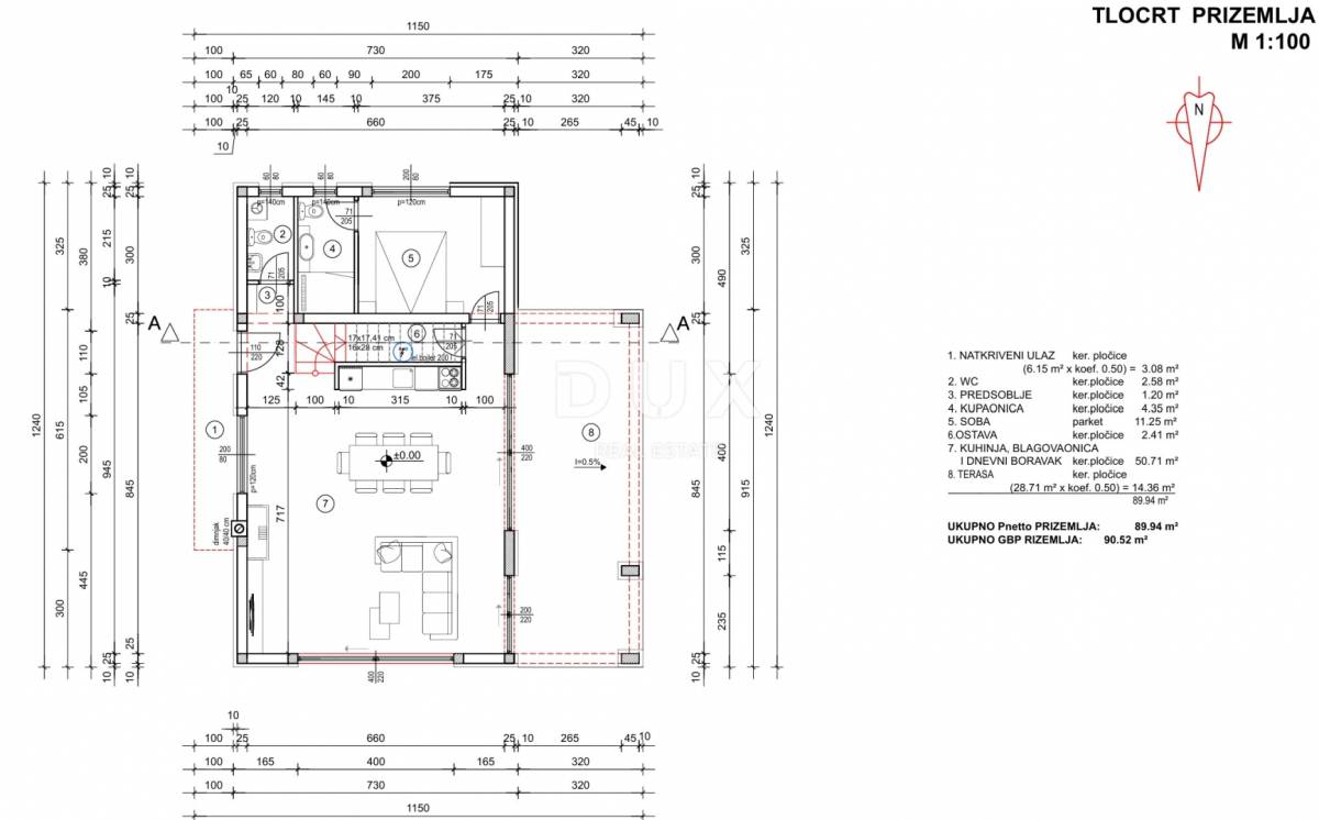 --> Prizemlje (GBP 90,50 m²) sastoji se od ulaza, wc-a, predsoblja, kupaonice, jedne sobe, ostave, prostranog open space dnevnog boravka s kuhinjom i blagovaonicom, terase te stubišta.