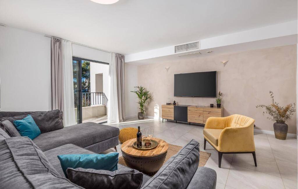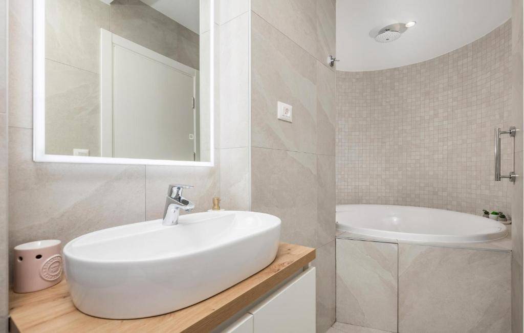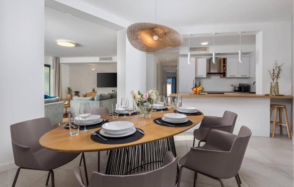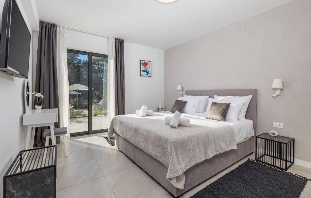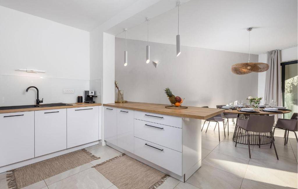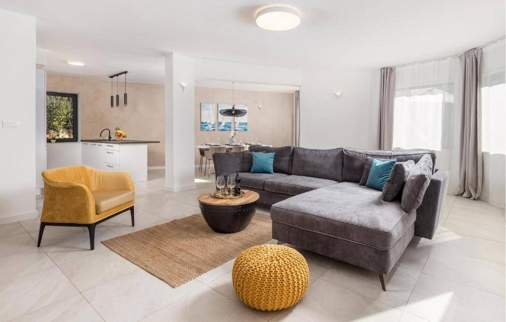 Prizemlje je osmišljeno kao zasebna luksuzna cjelina s još jednim trosobnim apartmanom, tri moderno dizajnirane kupaonice, dodatnim WC-om te elegantnim dnevnim boravkom, potpuno opremljenom kuhinjom i blagovaonicom koji se nastavljaju na vanjsku terasu. Svaka prostorija u vili opremljena je vrhunskim materijalima i najnovijom tehnologijom, uključujući podno električno grijanje koje osigurava ugodnu atmosferu tijekom cijele godine.