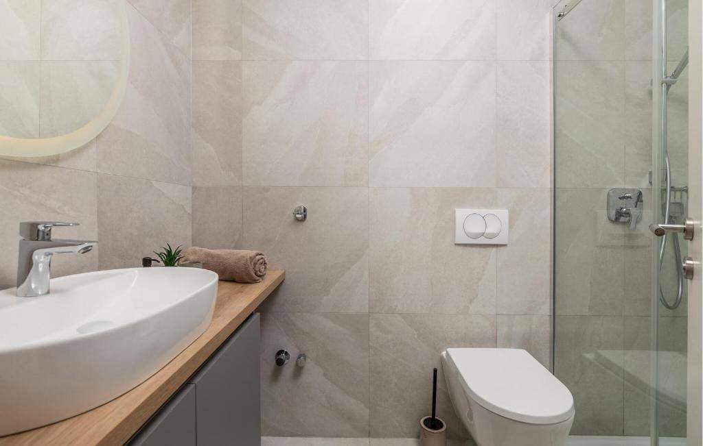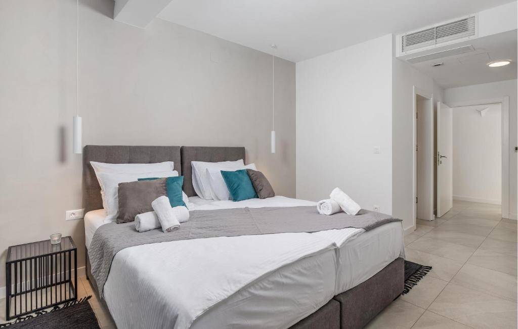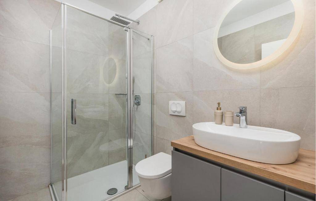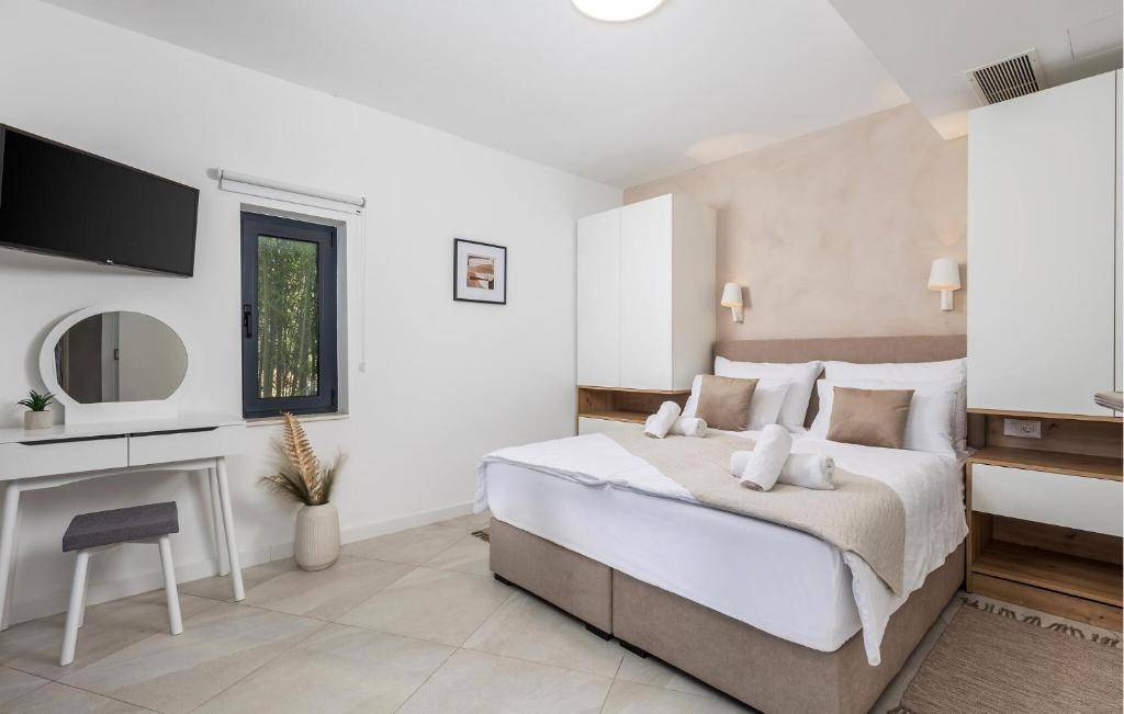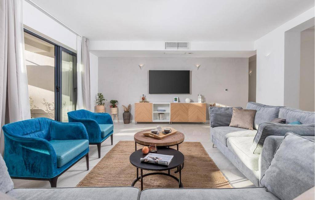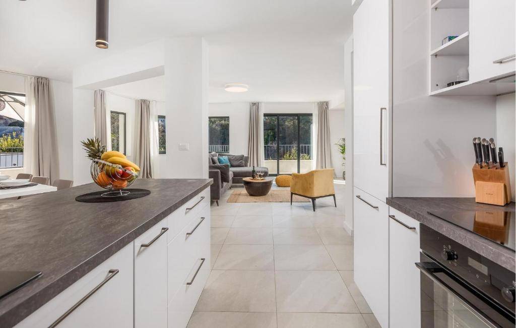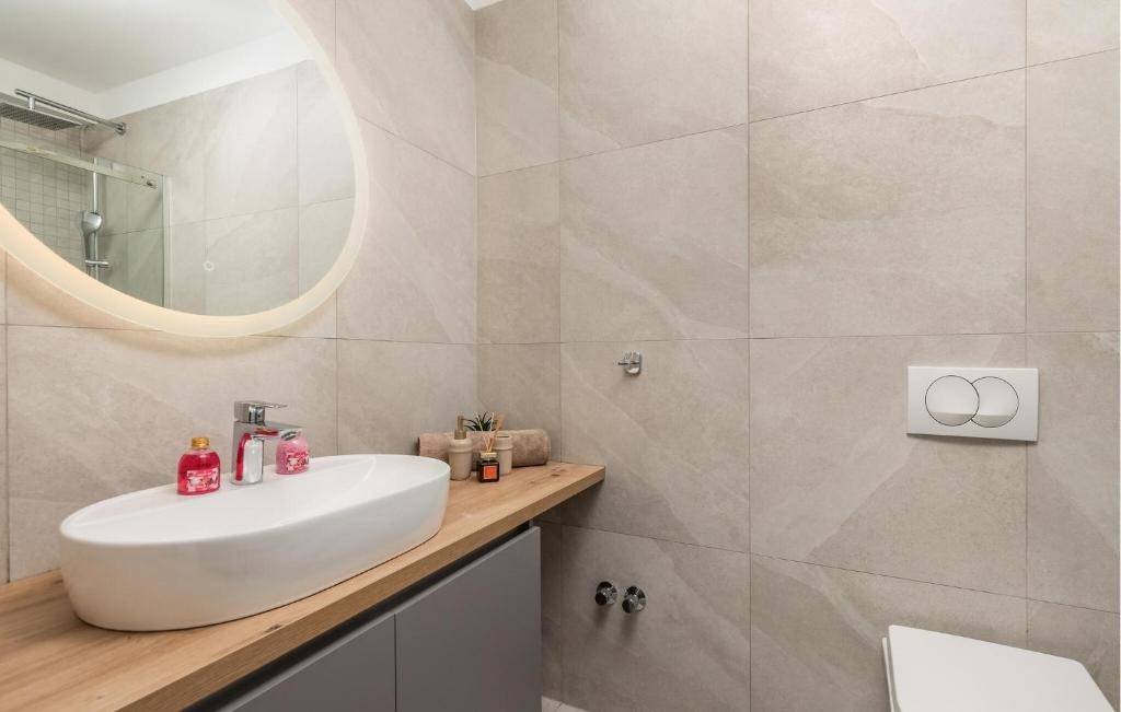 Prizemlje je osmišljeno kao zasebna luksuzna cjelina s još jednim trosobnim apartmanom, tri moderno dizajnirane kupaonice, dodatnim WC-om te elegantnim dnevnim boravkom, potpuno opremljenom kuhinjom i blagovaonicom koji se nastavljaju na vanjsku terasu. Svaka prostorija u vili opremljena je vrhunskim materijalima i najnovijom tehnologijom, uključujući podno električno grijanje koje osigurava ugodnu atmosferu tijekom cijele godine.