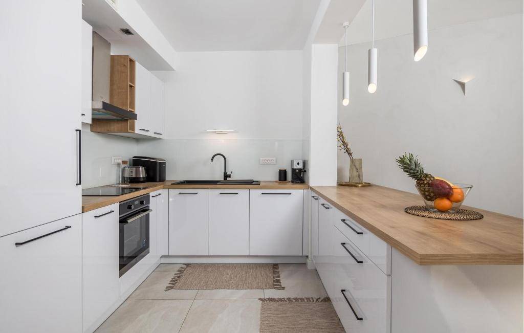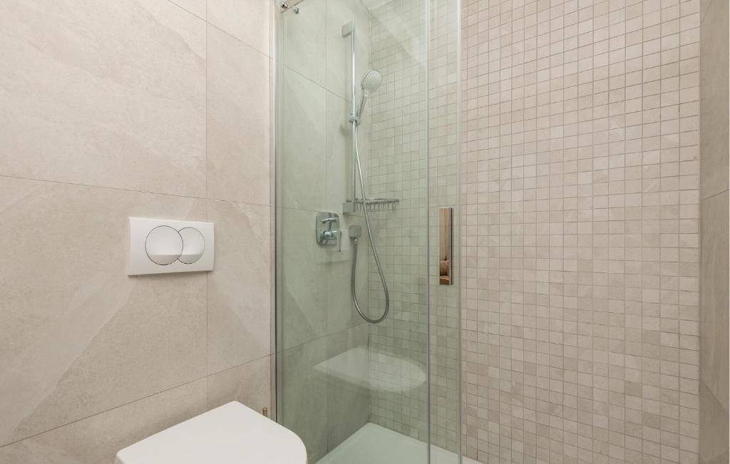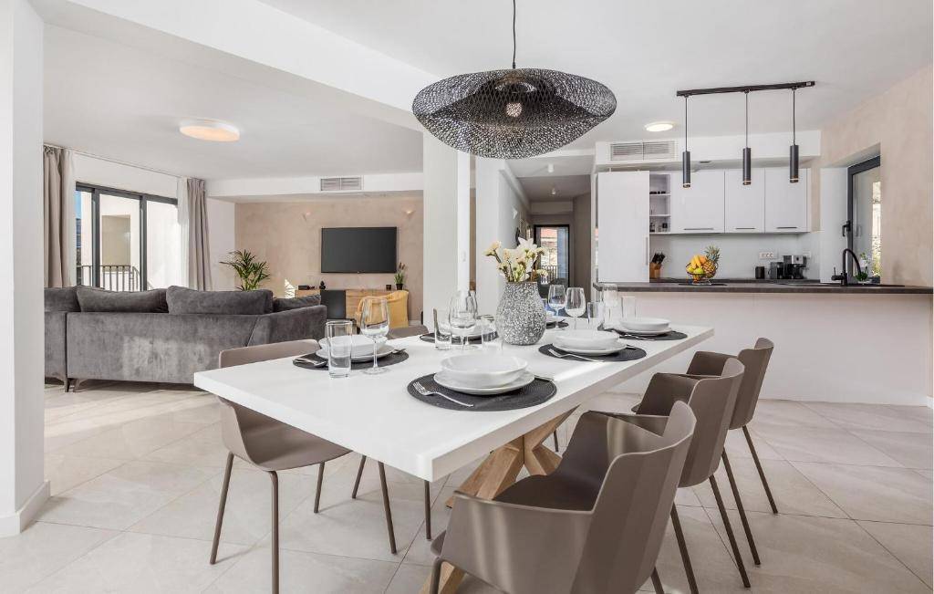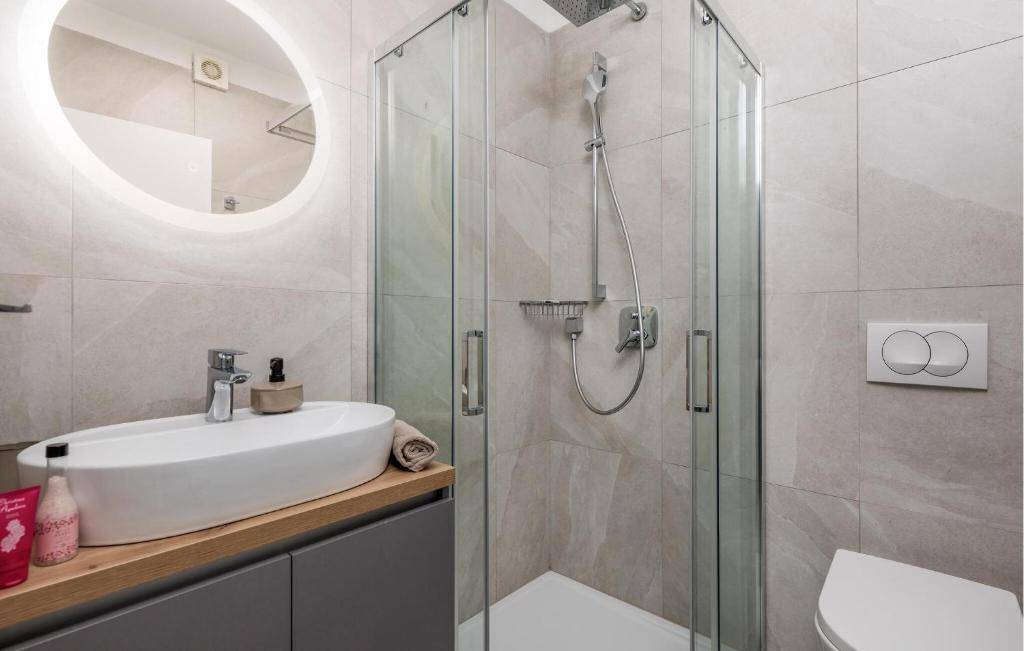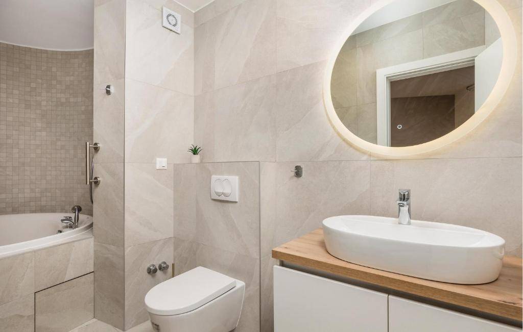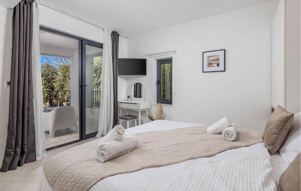 Prizemlje je osmišljeno kao zasebna luksuzna cjelina s još jednim trosobnim apartmanom, tri moderno dizajnirane kupaonice, dodatnim WC-om te elegantnim dnevnim boravkom, potpuno opremljenom kuhinjom i blagovaonicom koji se nastavljaju na vanjsku terasu. Svaka prostorija u vili opremljena je vrhunskim materijalima i najnovijom tehnologijom, uključujući podno električno grijanje koje osigurava ugodnu atmosferu tijekom cijele godine.