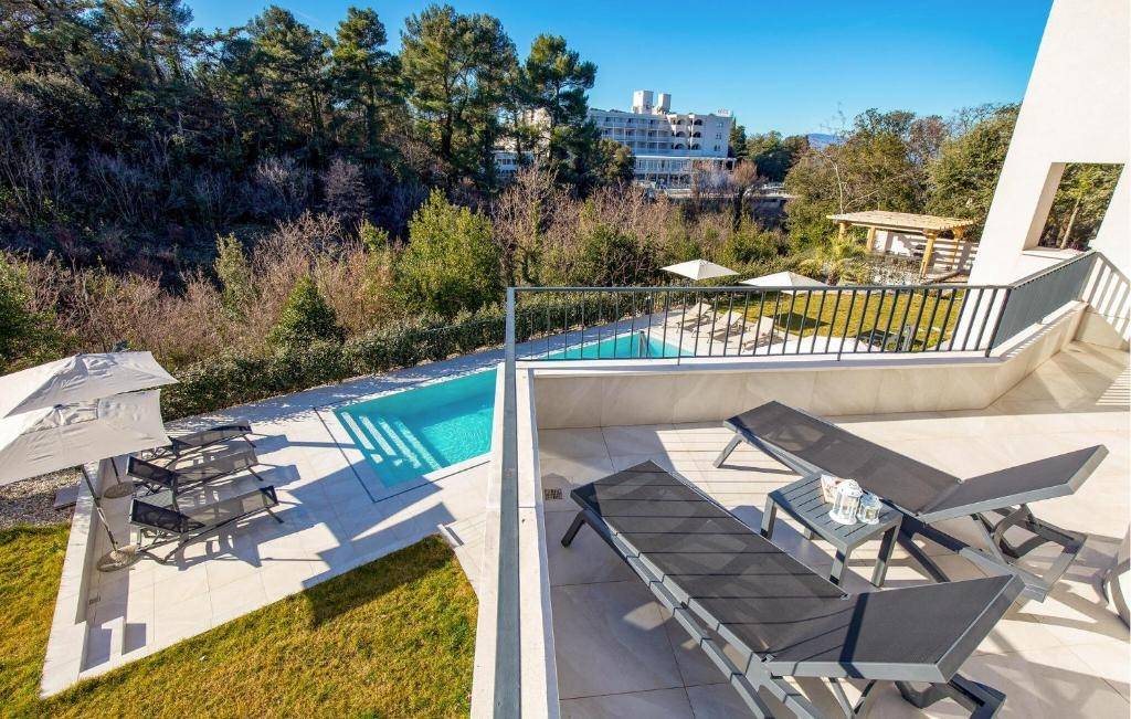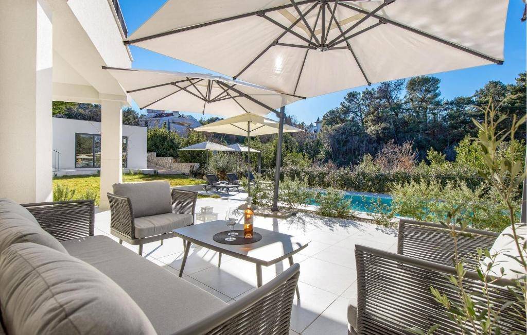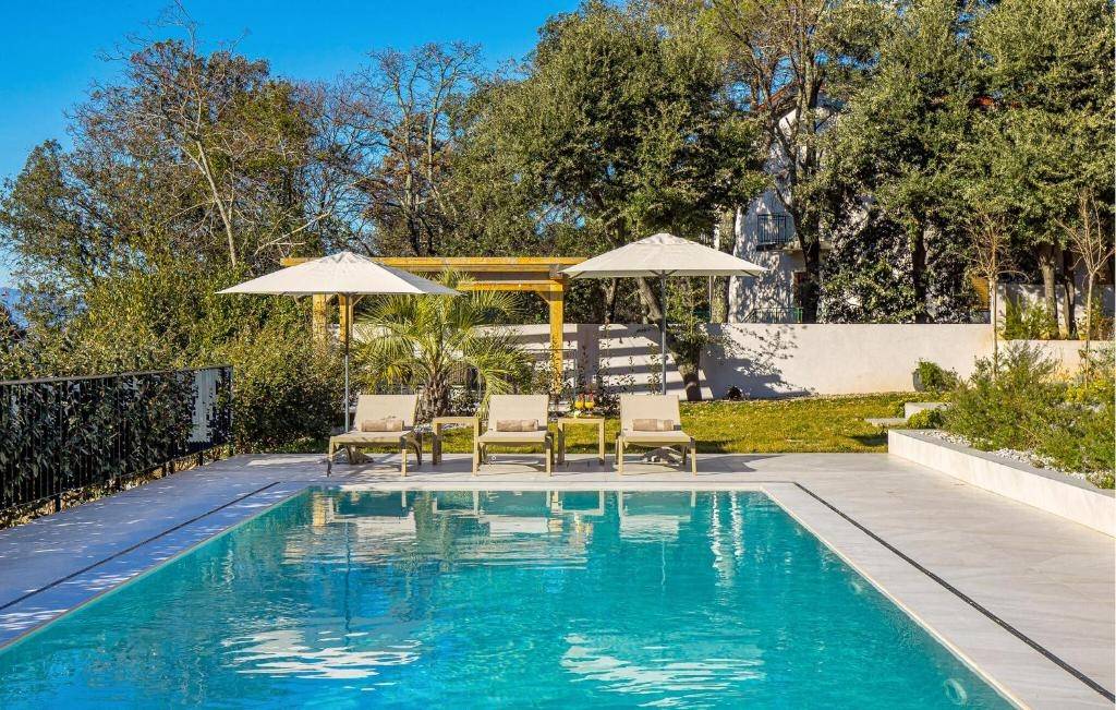 Središnji dio eksterijera čini prekrasan grijani bazen okružen sunčalištem i mediteranskim vrtom koji pruža privatnost i opuštajući ambijent. Ljetna kuhinja smještena uz bazen savršeno je mjesto za druženja i gastronomske užitke, a ispod nje se nalazi objekt koji je trenutno u funkciji spremišta, no može se preurediti u studio apartman za osoblje s kuhinjom i kupaonicom.