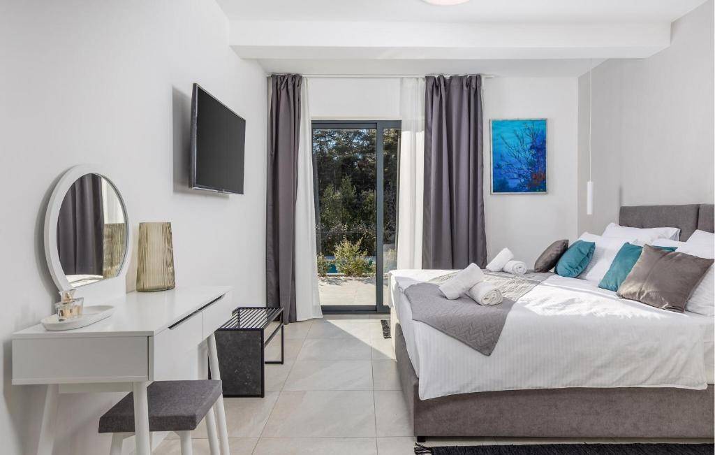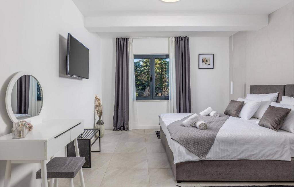 Vila se prostire na dvije etaže, a svaka nudi potpuno opremljen trosobni apartman. Na katu se nalazi elegantno uređen apartman s tri spavaće sobe, tri moderno dizajnirane kupaonice, ostavom te prostranim dnevnim boravkom, potpuno opremljenom kuhinjom i blagovaonicom koji odišu udobnošću i stilom. Velike staklene stijene osiguravaju obilje prirodne svjetlosti i omogućuju neometan pogled na more.