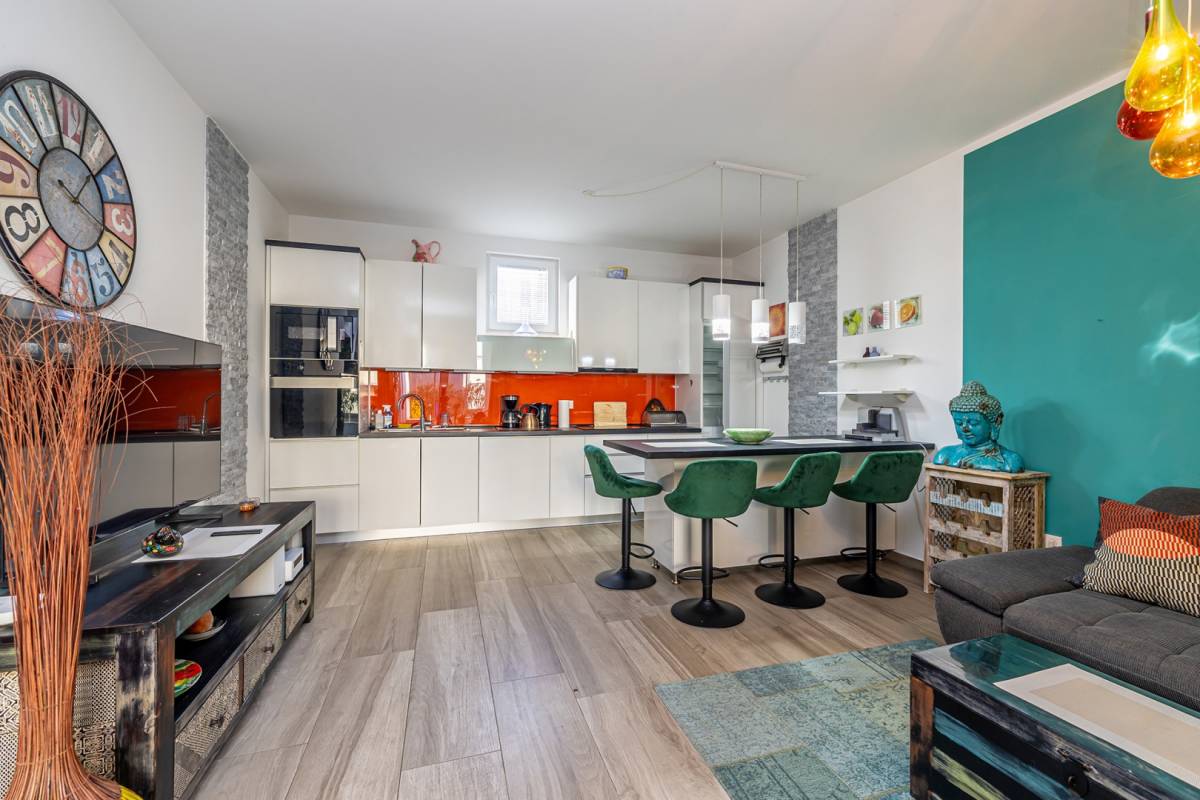 Unutarnji prostor obuhvaća hodnik, dnevni boravak povezan s kuhinjom i blagovaonicom, dvije sobe, WC kupaonicu te dodatno spremište, pri čemu je raspored funkcionalan i prilagođen svakodnevnom korištenju bez nepotrebnih prolaza. Stan se prodaje potpuno namješten i opremljen, što omogućuje trenutno korištenje bez dodatnih ulaganja.
