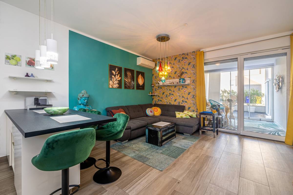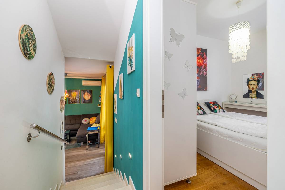 Vanjski dio uključuje zatvorenu loggiu koja se može koristiti tijekom cijele godine, nenatkrivenu terasu s roštiljem te vanjski tuš, što dodatno naglašava mediteranski karakter nekretnine i kvalitetu boravka na otvorenom. Osigurano je i vlastito parkirno mjesto, što je značajna prednost u ovoj zoni.