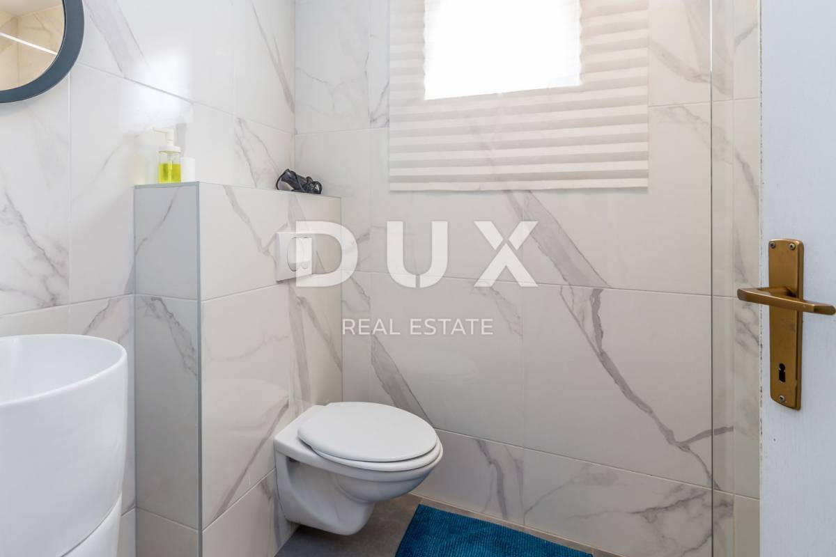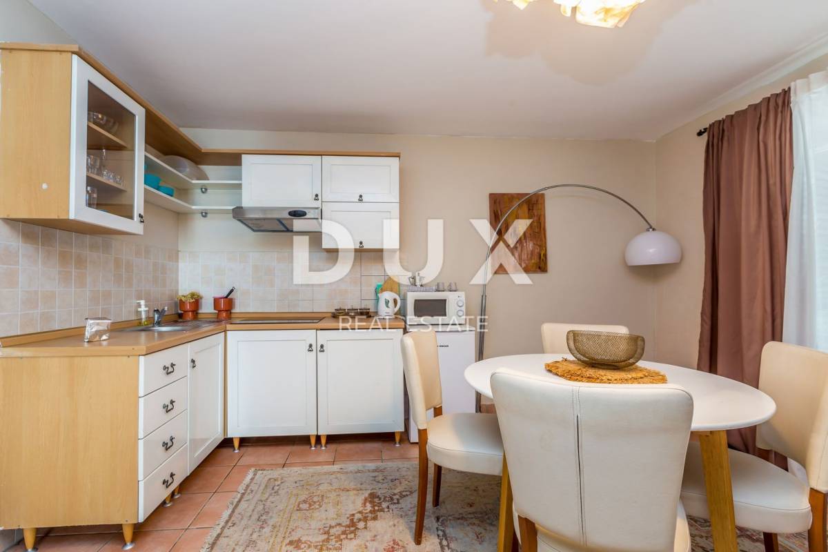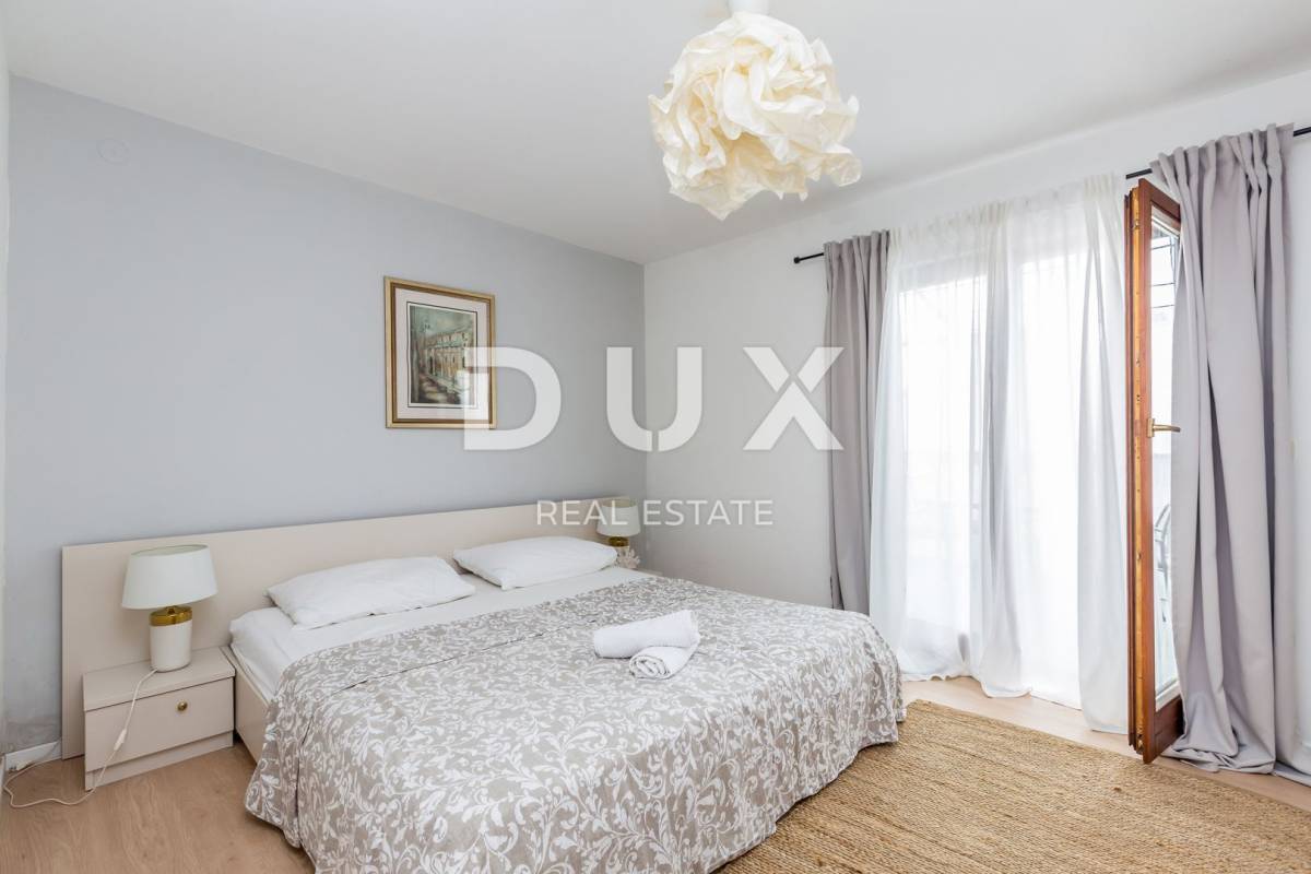 Nalazi se na oko 450 metara od mora na mirnoj lokaciji. Etaža je podijeljena na dva jednaka apartmana koji se sastoje od kupaonice, spavaće sobe, kuhinje, blagovaonice i dnevnog boravka, te ukupno s tri terase. Objekt se prodaje potpuno namješten, a pripada mu jedno parkirno mjesto. Ovo je dobra opcija za iznajmljivanje, ali i za vlastito uživanje u dobroj poziciji i moru.