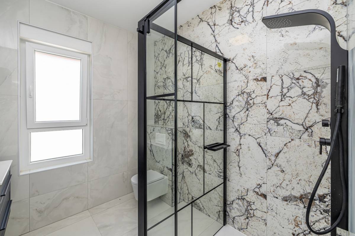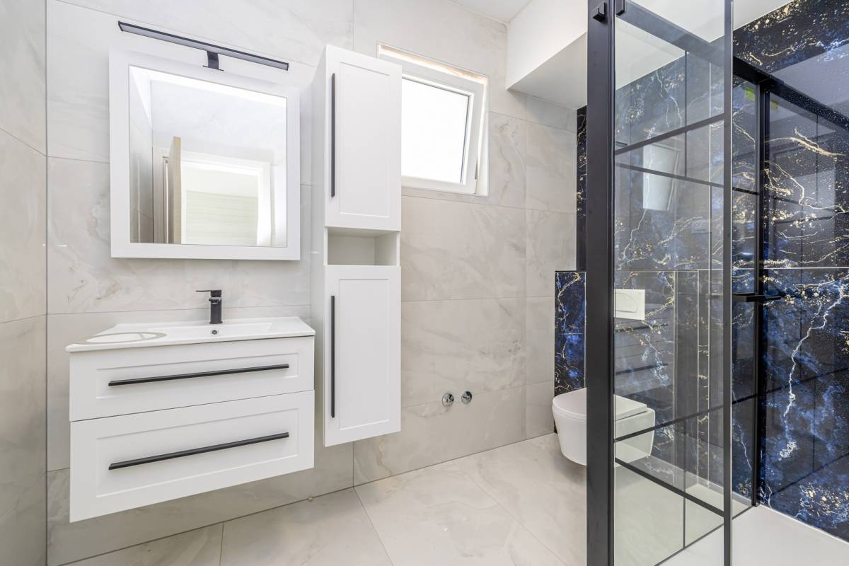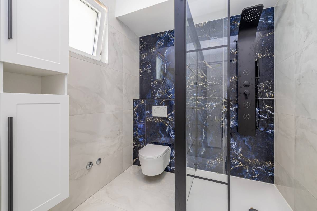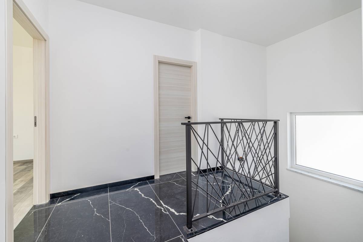 Raspoređena na dvije etaže i ukupne površine od približno 200 m², vila pruža savršen spoj udobnosti, elegancije i suvremenog stila. Prizemlje je zamišljeno kao otvoreni dnevni prostor za uživanje i druženje, prostrani dnevni boravak s modernim kaminom povezan je s kuhinjom i blagovaonicom, a sve ima izravan izlaz na natkrivenu terasu i uređenu mediteransku okućnicu. Ovdje dominira bazen s integriranim sustavom za protustrujno plivanje, jacuzzi, vanjski roštilj i sunčalište, stvarajući atmosferu potpune privatnosti i užitka. U prizemlju se nalaze i dodatna kupaonica, WC te elegantna sauna za trenutke opuštanja.
