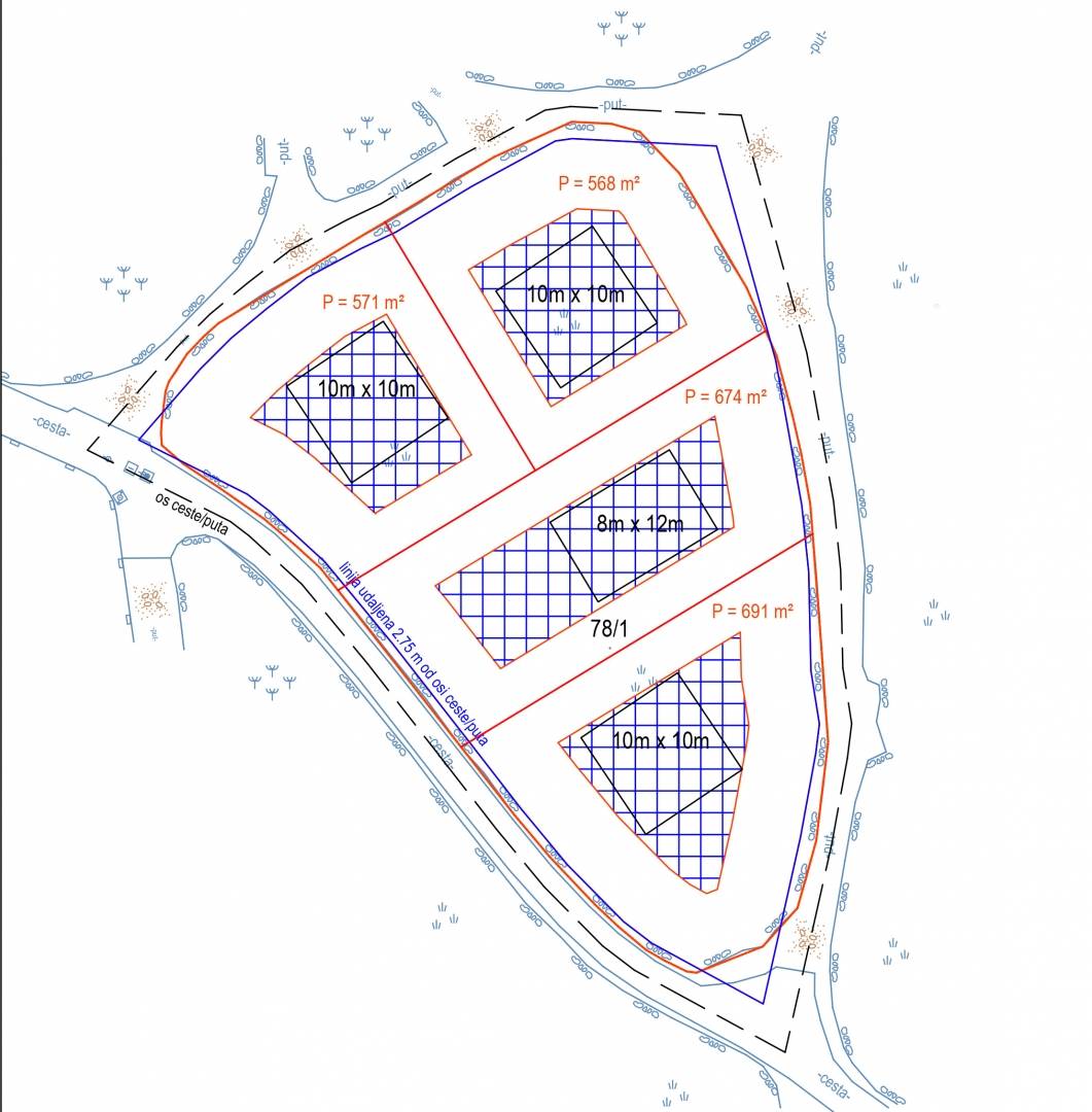 Zemljište je dovoljno veliko da se podijeli na četiri posebne parcele, od kojih svaka omogućuje gradnju stambenih objekata s podrumom i dvije etaže. Posebna prednost ove lokacije jest prekrasan pogled na more koji se otvara već s prvog kata, pružajući dodatnu vrijednost budućim vlasnicima.