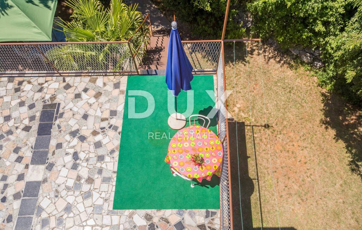 Kuća je na dvije etaže, ima vanjsko stepenište i prostranu terasu na 1. katu. U prizemlju je velika kamenom popločena terasa, prekrasan vrt u kojem je i zidani roštilj.