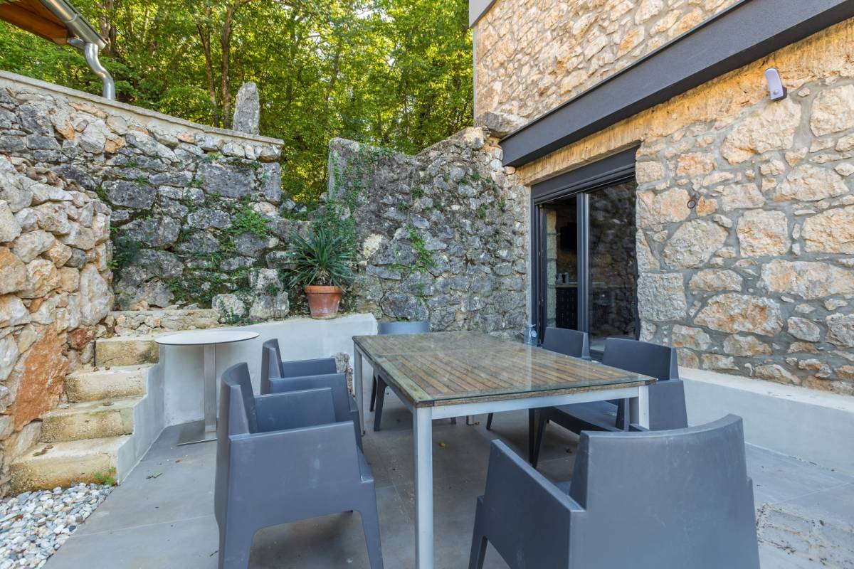 Prostrana i pomno uređena okućnica krasi preljevni bazen koji se skladno uklapa u prirodni ambijent i poziva na uživanje tijekom cijelog ljeta.