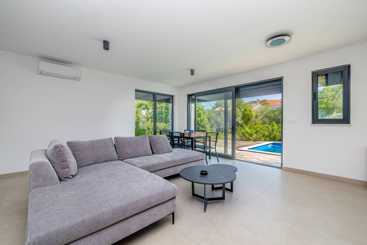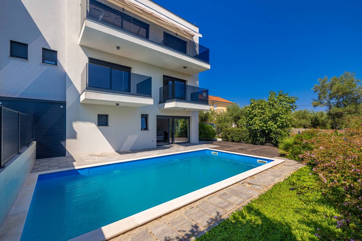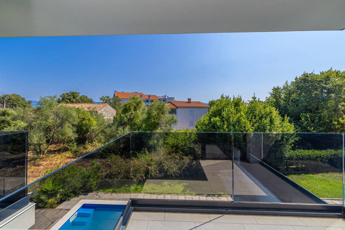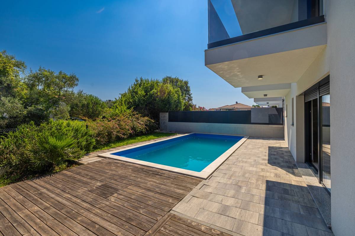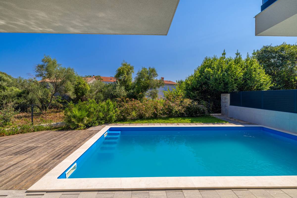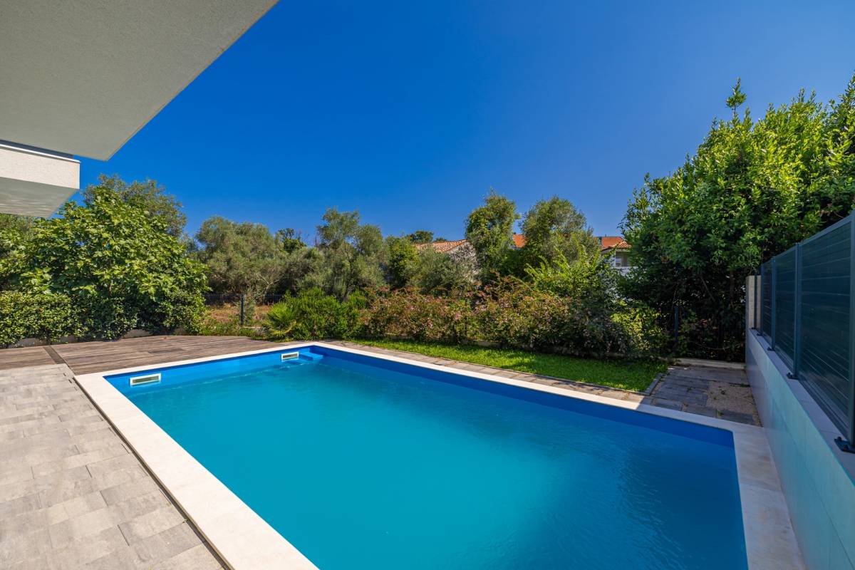 Vanjski prostor čini privatni bazen okružen uređenim vrtom, što stvara intimnu oazu mira. Apartmanu pripada i parkirno mjesto, dok vila ima svega četiri stambene jedinice, što osigurava mir i visoku razinu privatnosti.