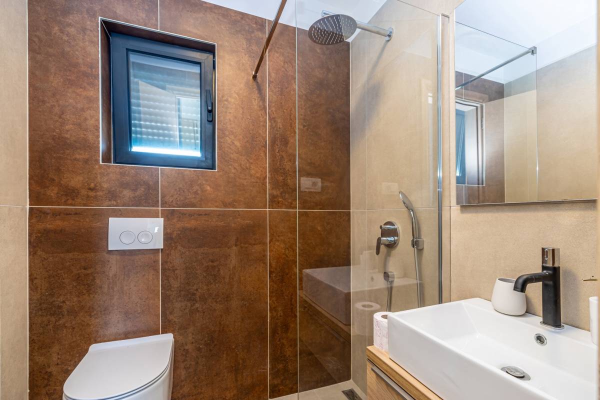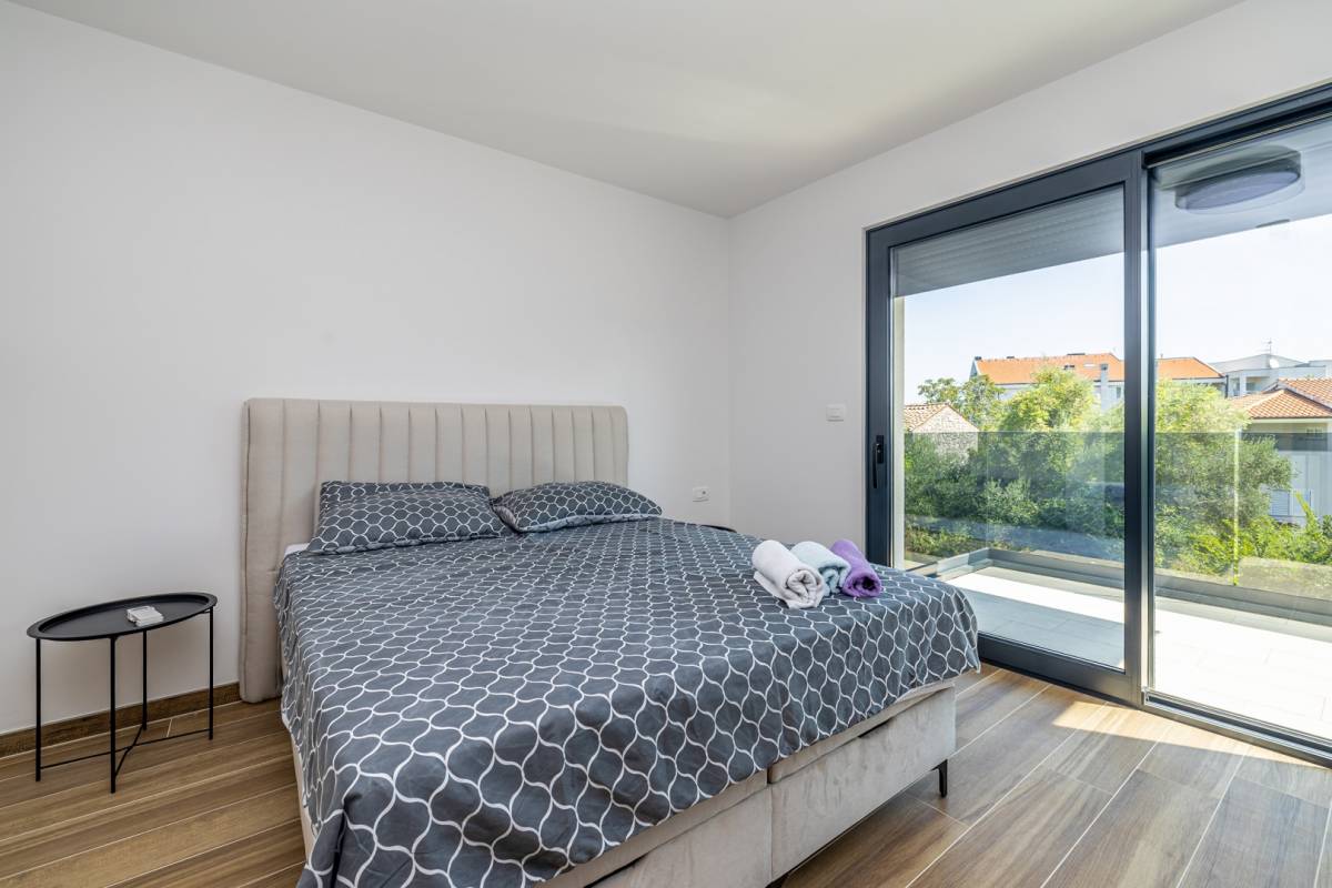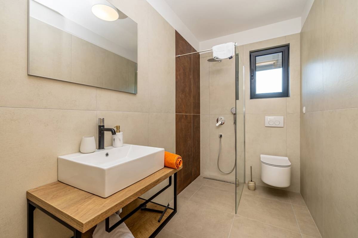 Apartman se prostire na dvije etaže te nudi prozračan i funkcionalan raspored. Sastoji se od tri prostrane spavaće sobe, svaka s vlastitom modernom kupaonicom, dodatnog WC-a te open space dnevnog boravka povezanog s kuhinjom i blagovaonicom. Posebnu vrijednost pružaju dva balkona, idealna za opuštanje i uživanje u mediteranskom ambijentu.