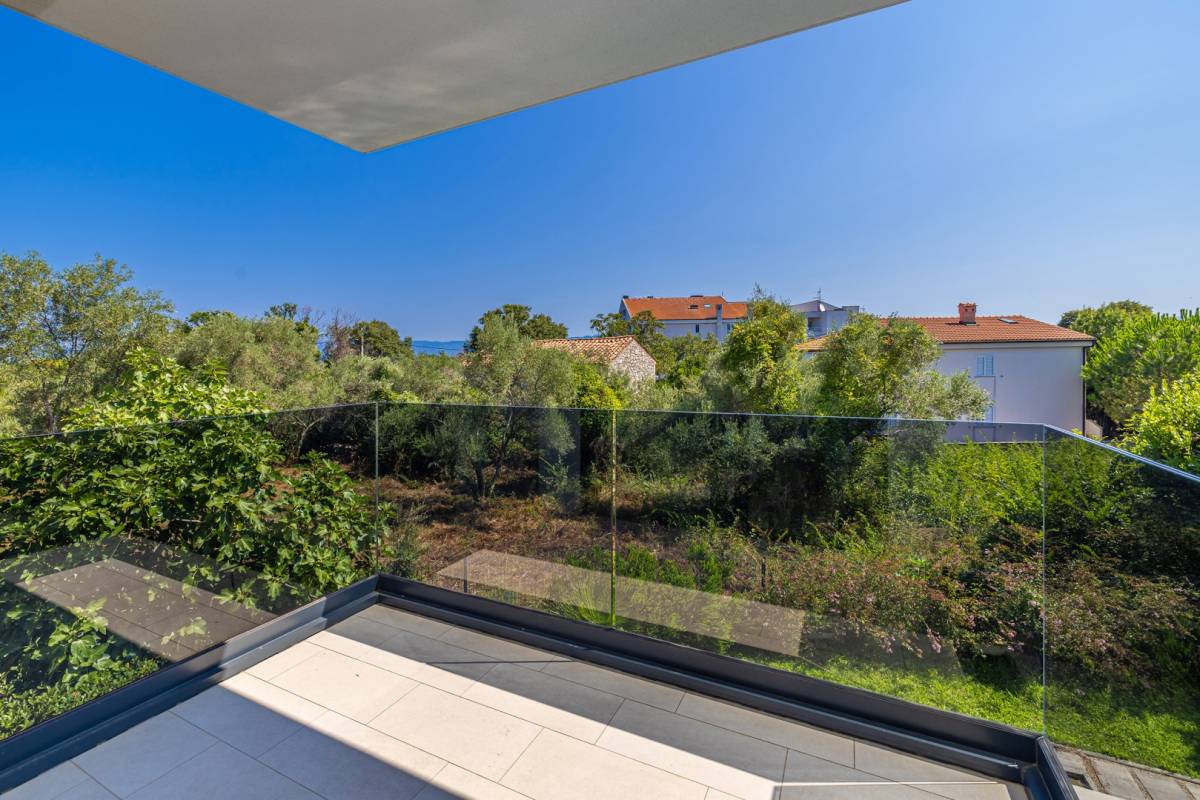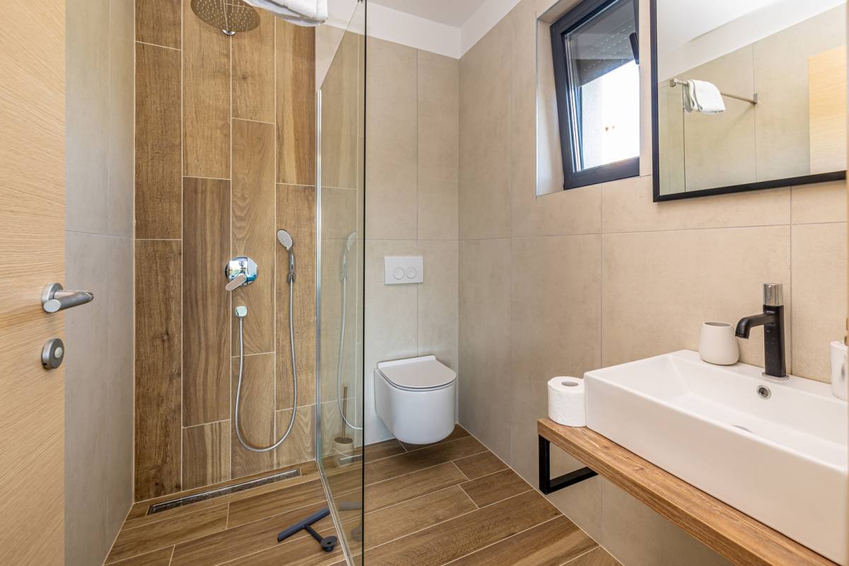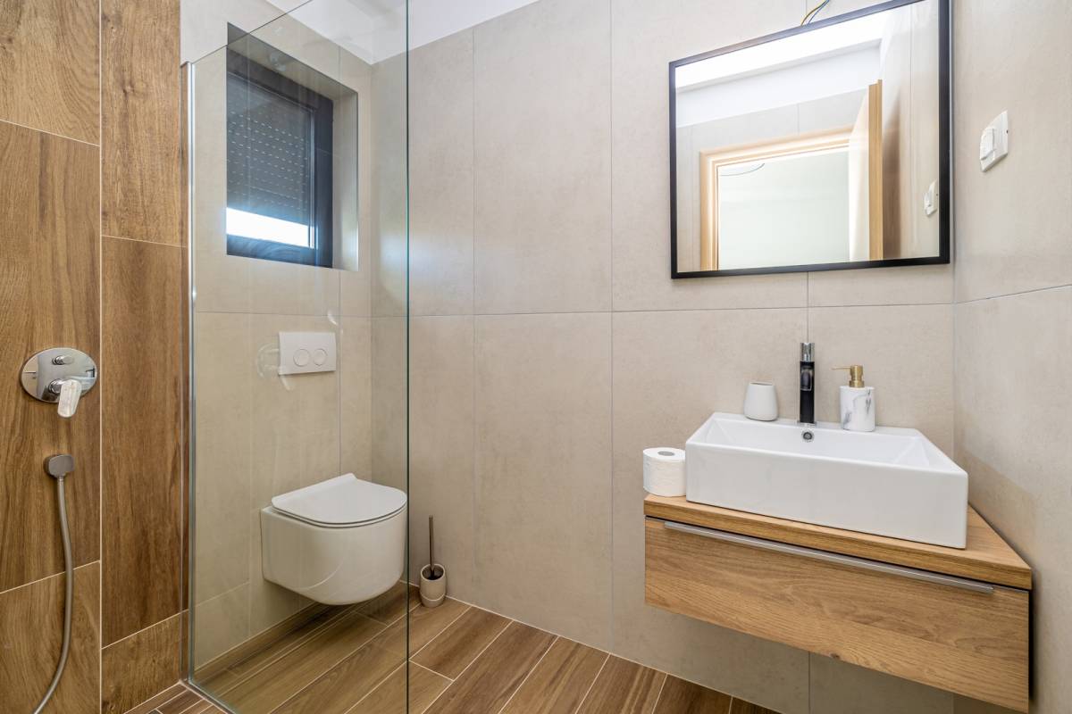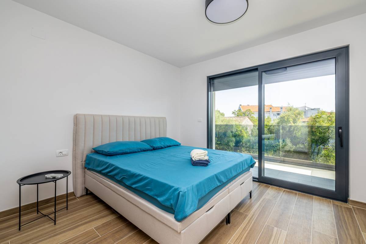 Apartman se prostire na dvije etaže te nudi prozračan i funkcionalan raspored. Sastoji se od tri prostrane spavaće sobe, svaka s vlastitom modernom kupaonicom, dodatnog WC-a te open space dnevnog boravka povezanog s kuhinjom i blagovaonicom. Posebnu vrijednost pružaju dva balkona, idealna za opuštanje i uživanje u mediteranskom ambijentu.