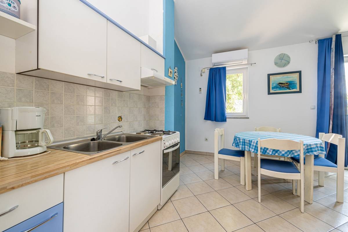 U mirnom dijelu mjesta Šilo na otoku Krku, na svega 500 metara od mora, nalazi se ovaj šarmantni apartman na prvom katu ukupne površine 47 m². Smješten u manjoj stambenoj jedinici s posebnim ulazom, apartman nudi mir, privatnost i funkcionalan raspored – savršen za odmor ili turistički najam.