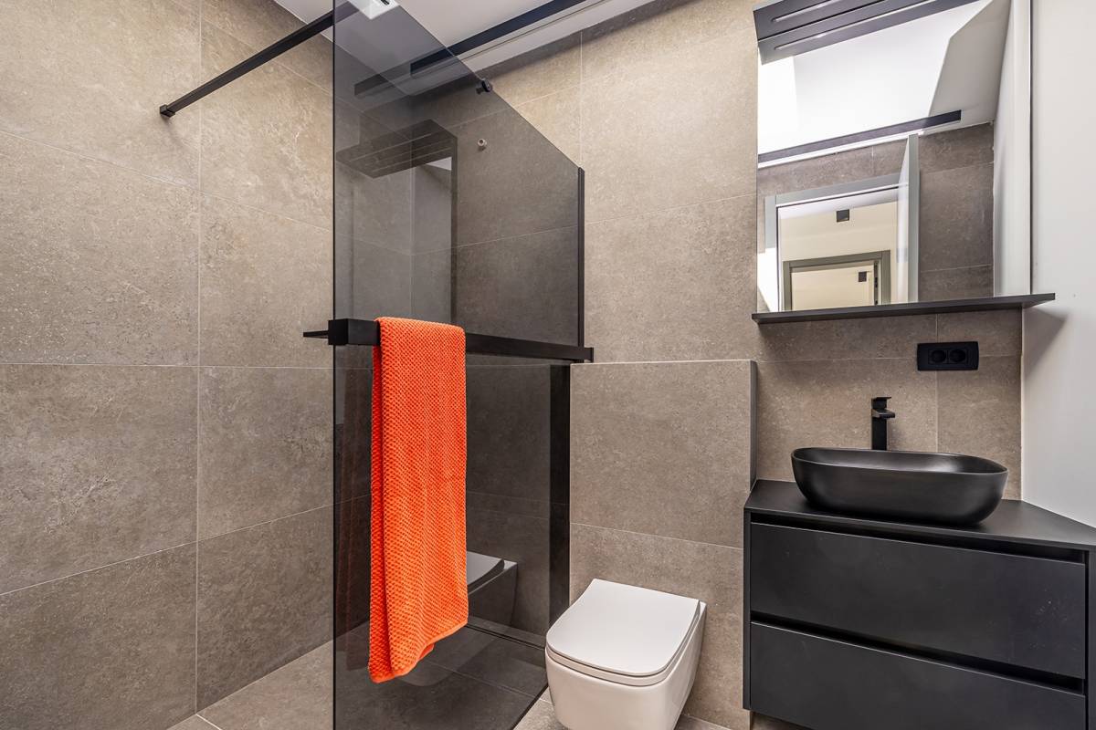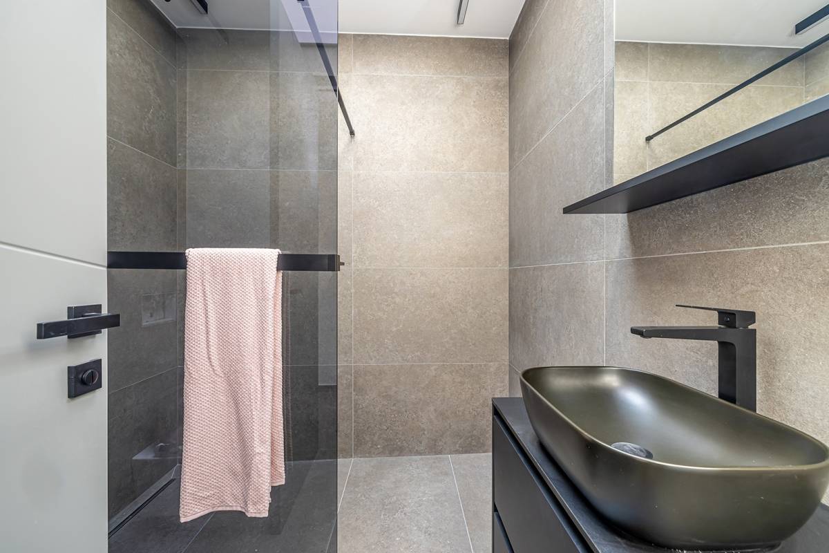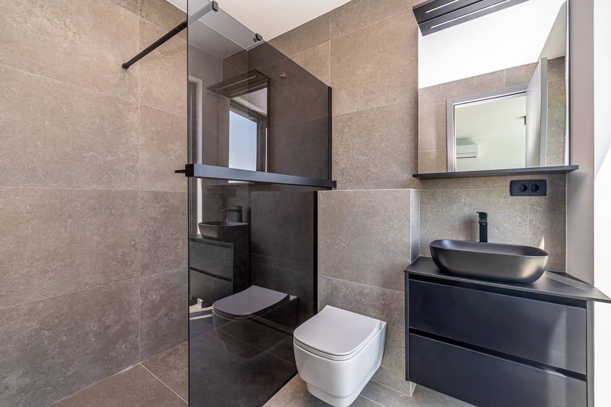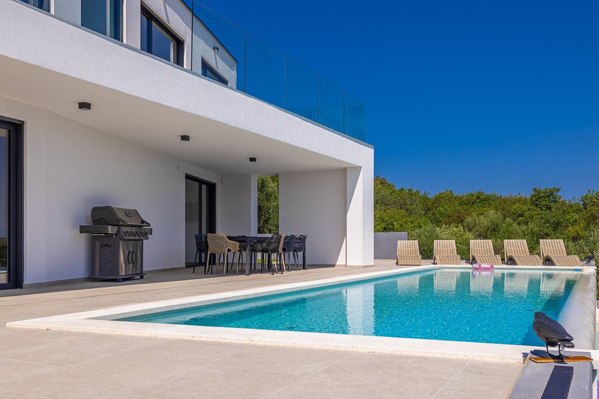 U prizemlju vile nalazi se garaža za jedno vozilo, vešeraj sa spremištem, kupaonica te prostrana prostorija za vježbanje. Otvoreni koncept kuhinje, blagovaonice i dnevnog boravka stvara prozračan i svijetao prostor s velikim staklenim stijenama koje omogućuju obilje dnevnog svjetla i izravan izlaz na luksuzno uređenu okućnicu. Vanjski prostor dominira modernim preljevnim bazenom s kristalno čistom vodom, prostranim sunčalištem, natkrivenom terasom i roštiljem, stvarajući idealno mjesto za uživanje i opuštanje na otvorenom.