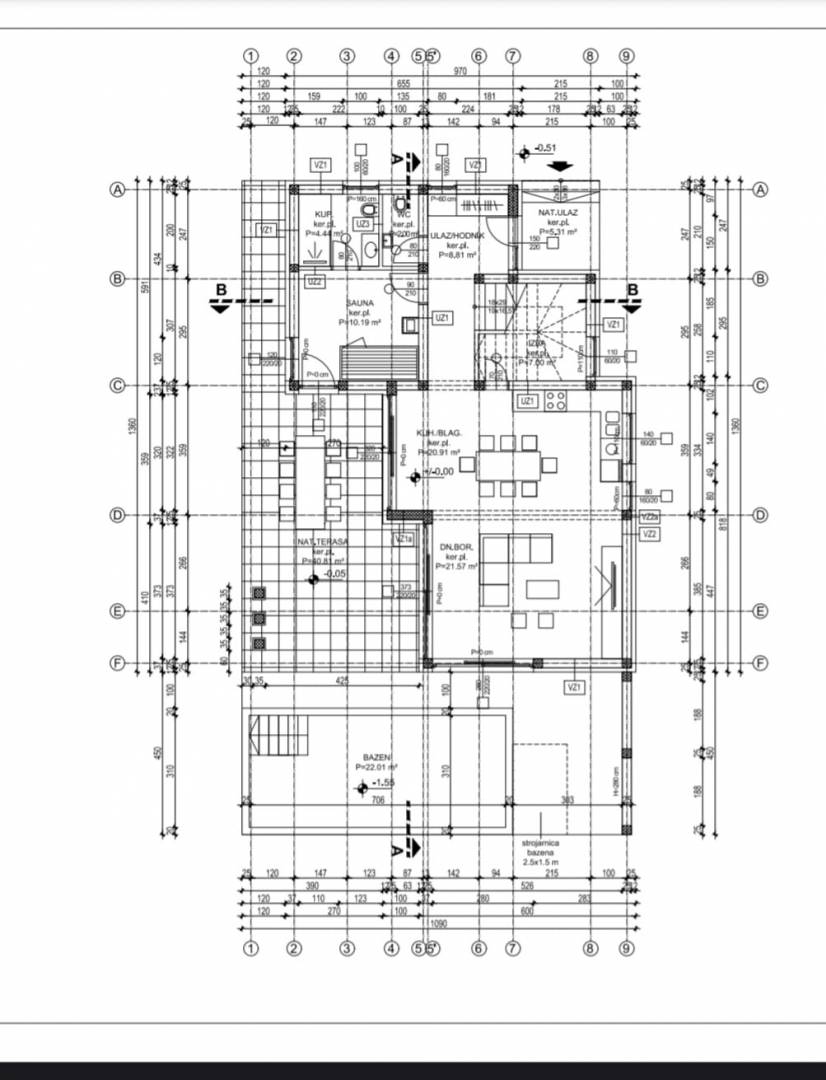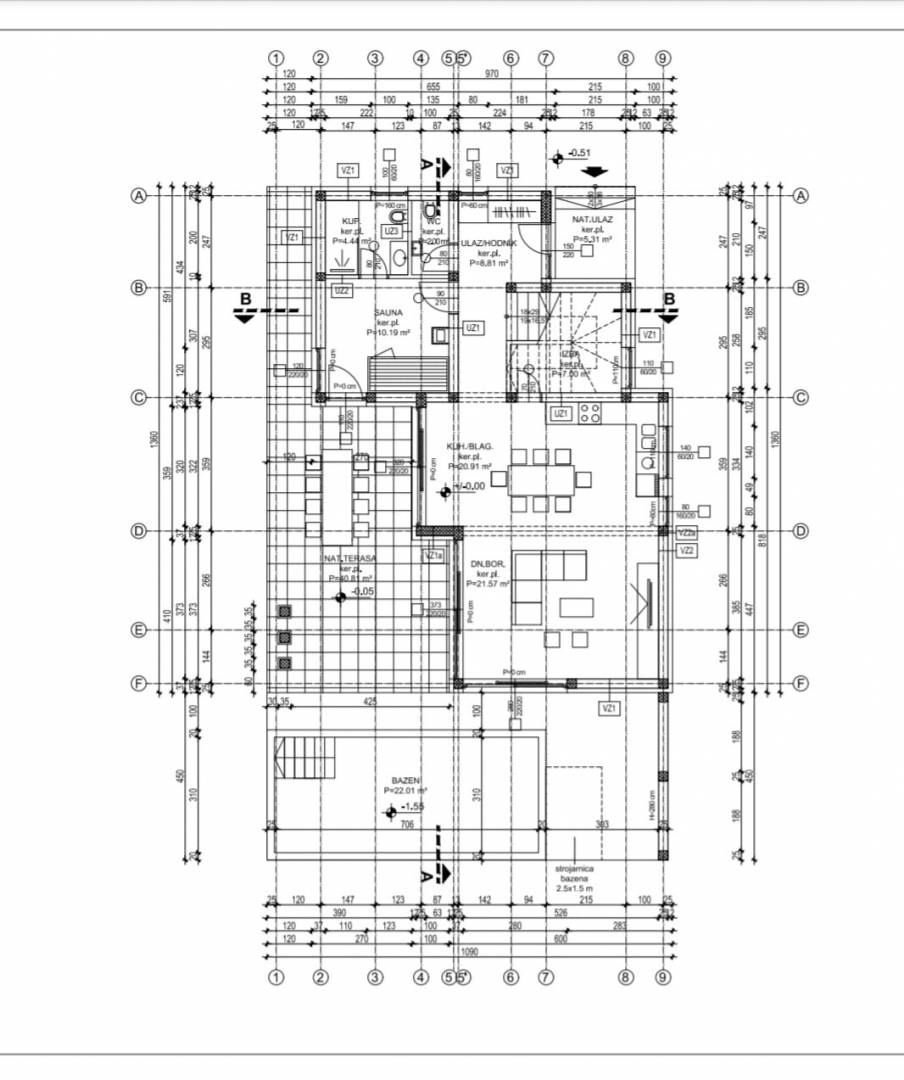 U prizemlju vile nalazi se prostrani dnevni boravak koji se skladno povezuje s modernom kuhinjom i blagovaonicom, a iz cijelog prostora pruža se direktan izlaz na natkrivenu terasu, sunčalište i bazen sa slanom vodom. Ova etaža dodatno uključuje jednu spavaću sobu s vlastitom kupaonicom, gostinjski toalet te praktično spremište.