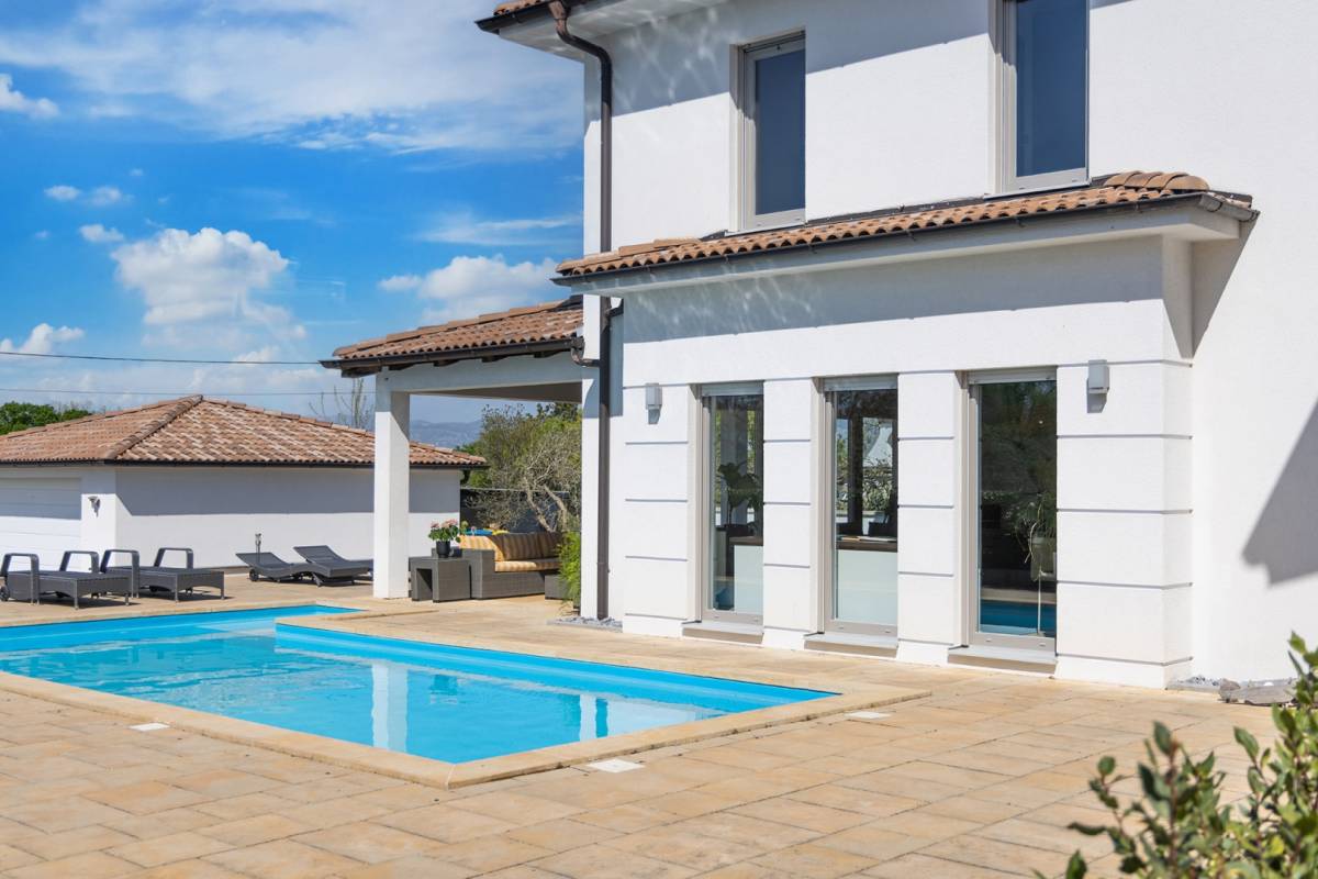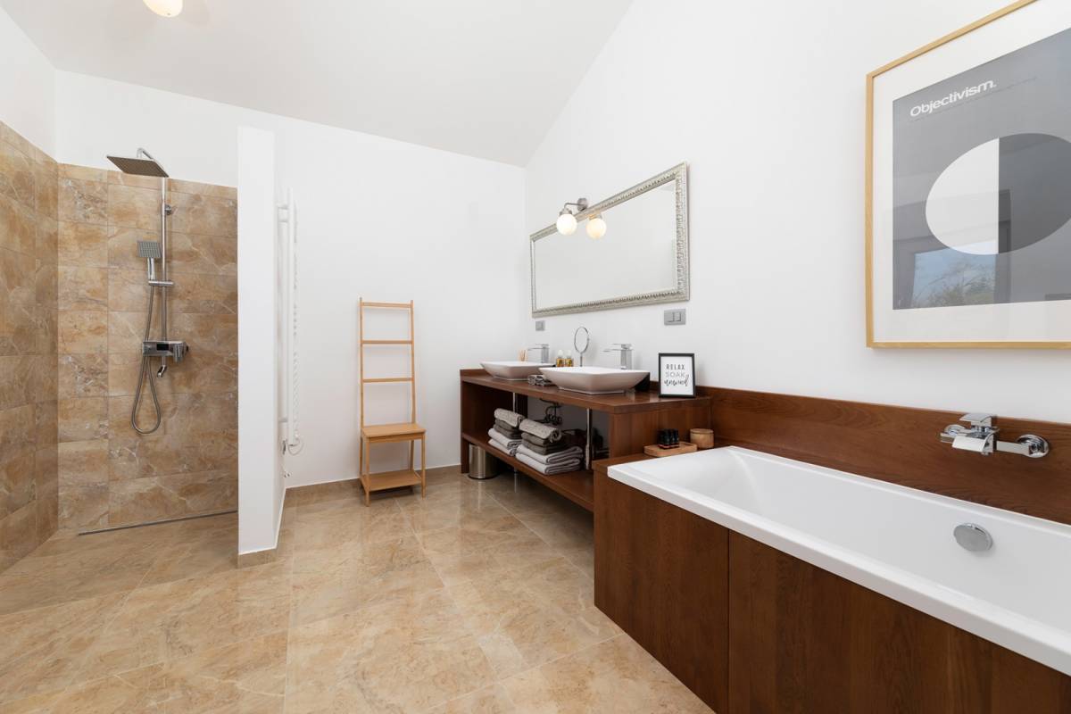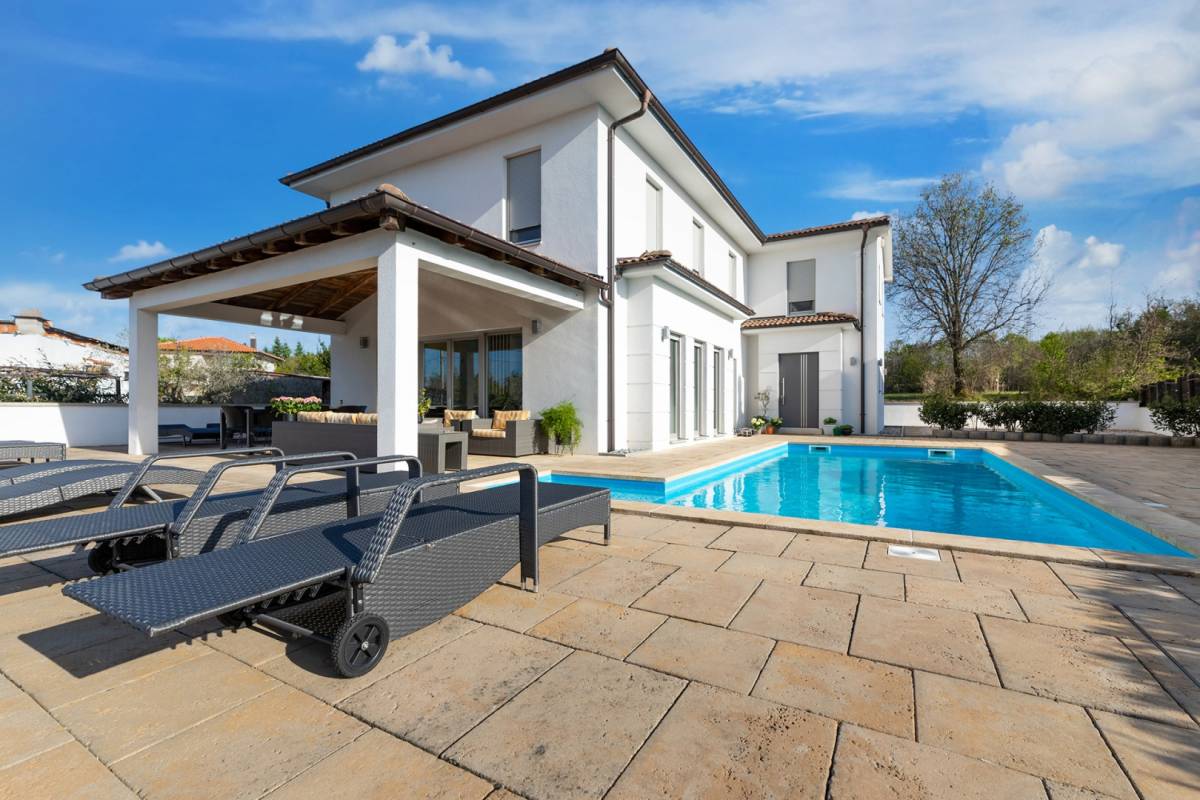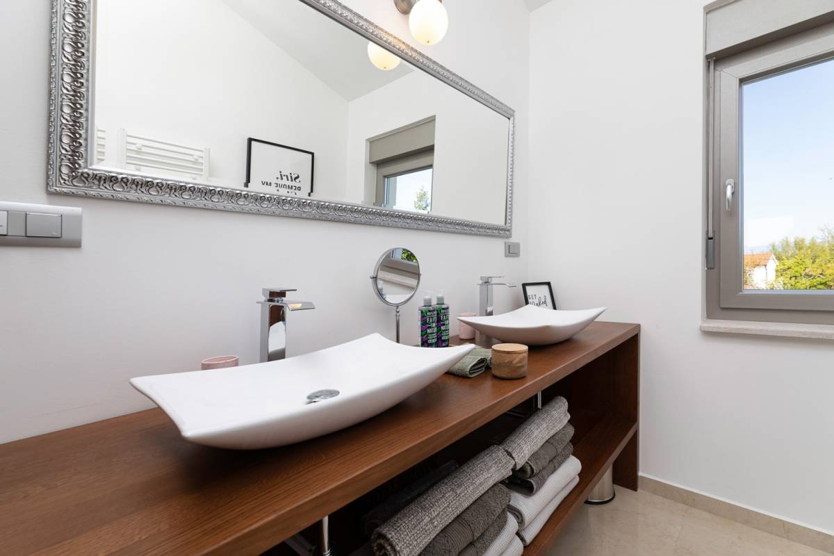 Vanjski prostor odiše mirom i privatnošću – ograđena okućnica površine 850 m² uređena je s ukusom i bez pretjerivanja, obogaćena mediteranskim biljem i detaljima koji stvaraju ambijent luksuznog ljetnikovca. U središtu dvorišta nalazi se bazen čistih linija, okružen prostranim sunčalištem i lounge zonom pod sjenicom – idealno za ljetna druženja, večernja opuštanja ili mirne doručke na otvorenom. Tu je i roštilj zona te garaža s dva natkrivena parkirna mjesta.