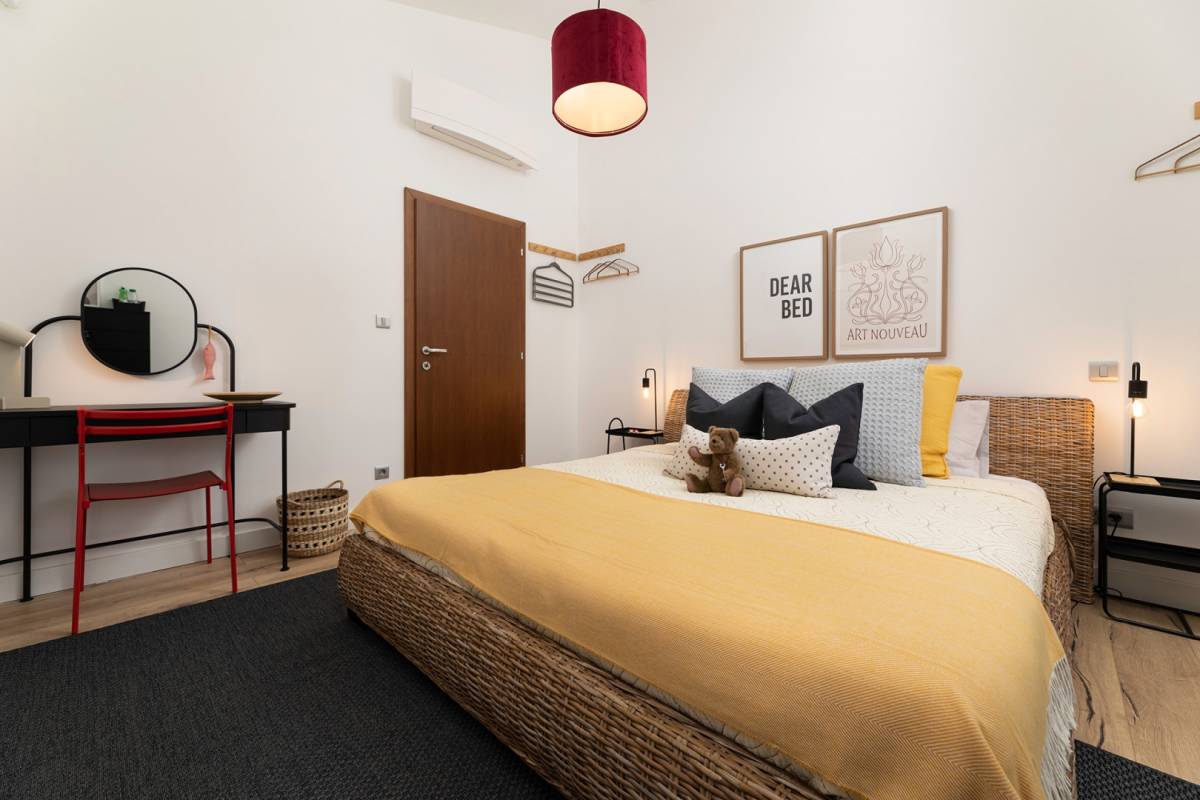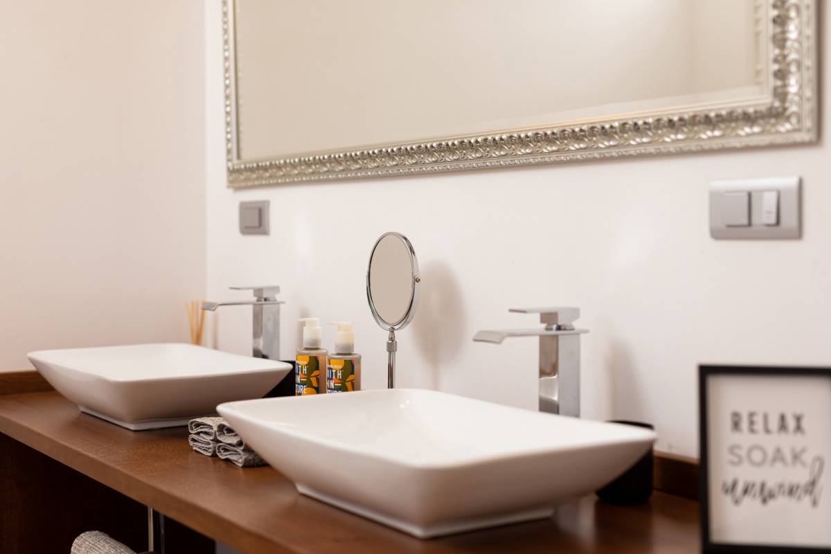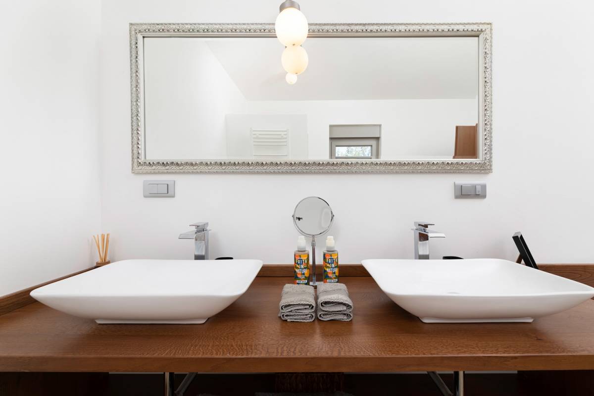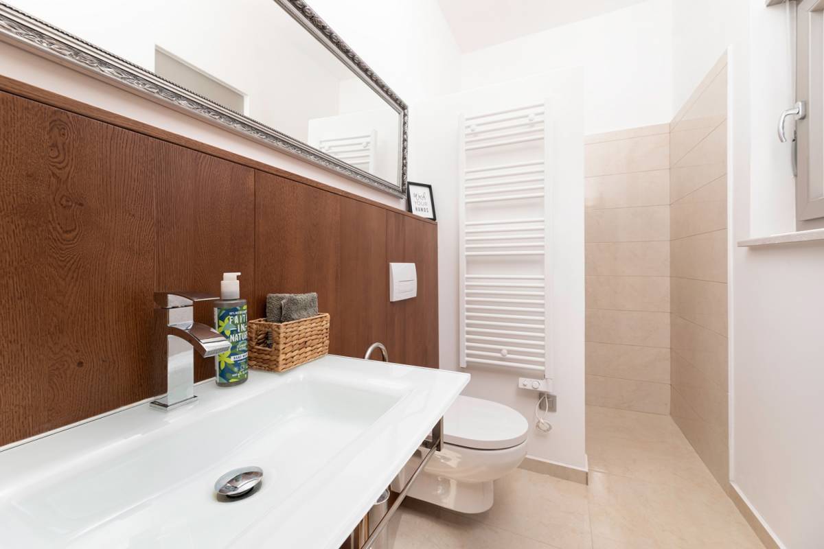 Vanjski prostor odiše mirom i privatnošću – ograđena okućnica površine 850 m² uređena je s ukusom i bez pretjerivanja, obogaćena mediteranskim biljem i detaljima koji stvaraju ambijent luksuznog ljetnikovca. U središtu dvorišta nalazi se bazen čistih linija, okružen prostranim sunčalištem i lounge zonom pod sjenicom – idealno za ljetna druženja, večernja opuštanja ili mirne doručke na otvorenom. Tu je i roštilj zona te garaža s dva natkrivena parkirna mjesta.