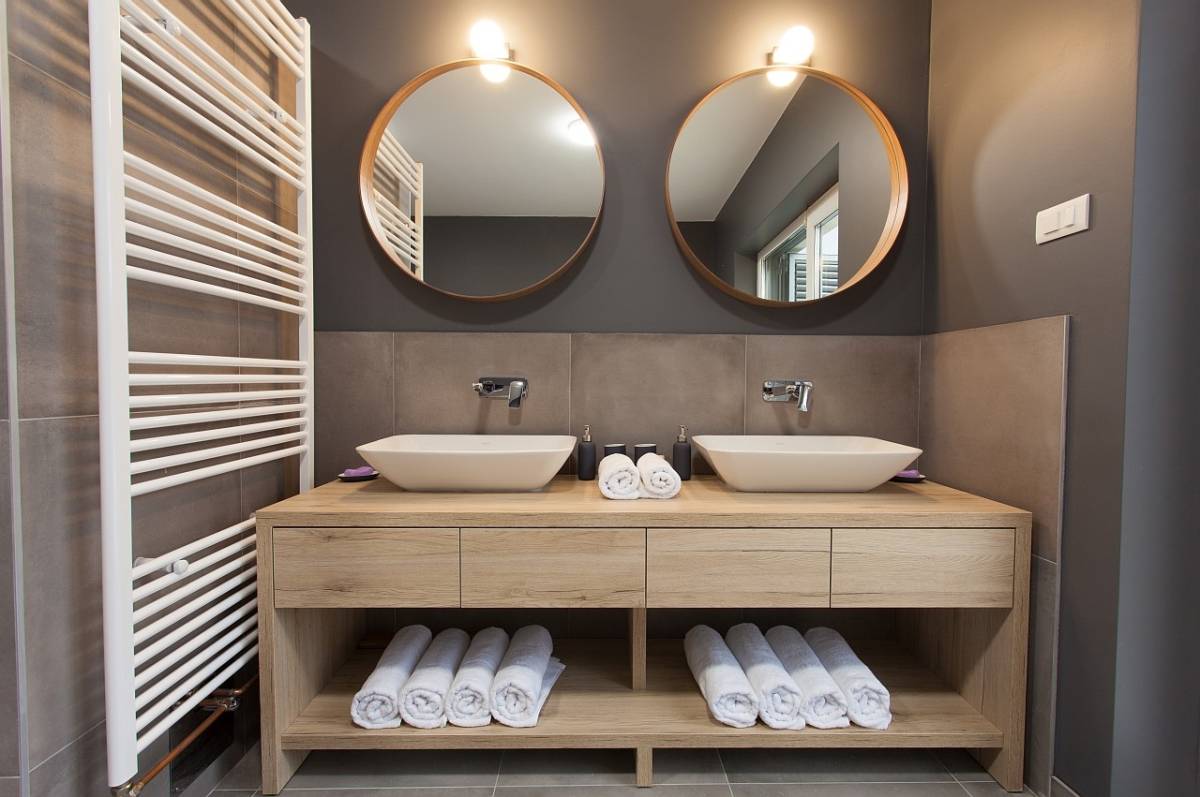 Na katu se nalaze tri komforne spavaće sobe i dvije kupaonice. Interijer je uređen s pažnjom prema detaljima, uz korištenje kvalitetne keramike, sanitarija i moderne opreme. Vila je opremljena dizalicom topline, ventilokonvektorima, solarnim panelima, pametnim upravljanjem grijanja i bazena putem mobilne aplikacije, punionicom za električna vozila, videonadzorom i alarmnim sustavom.
