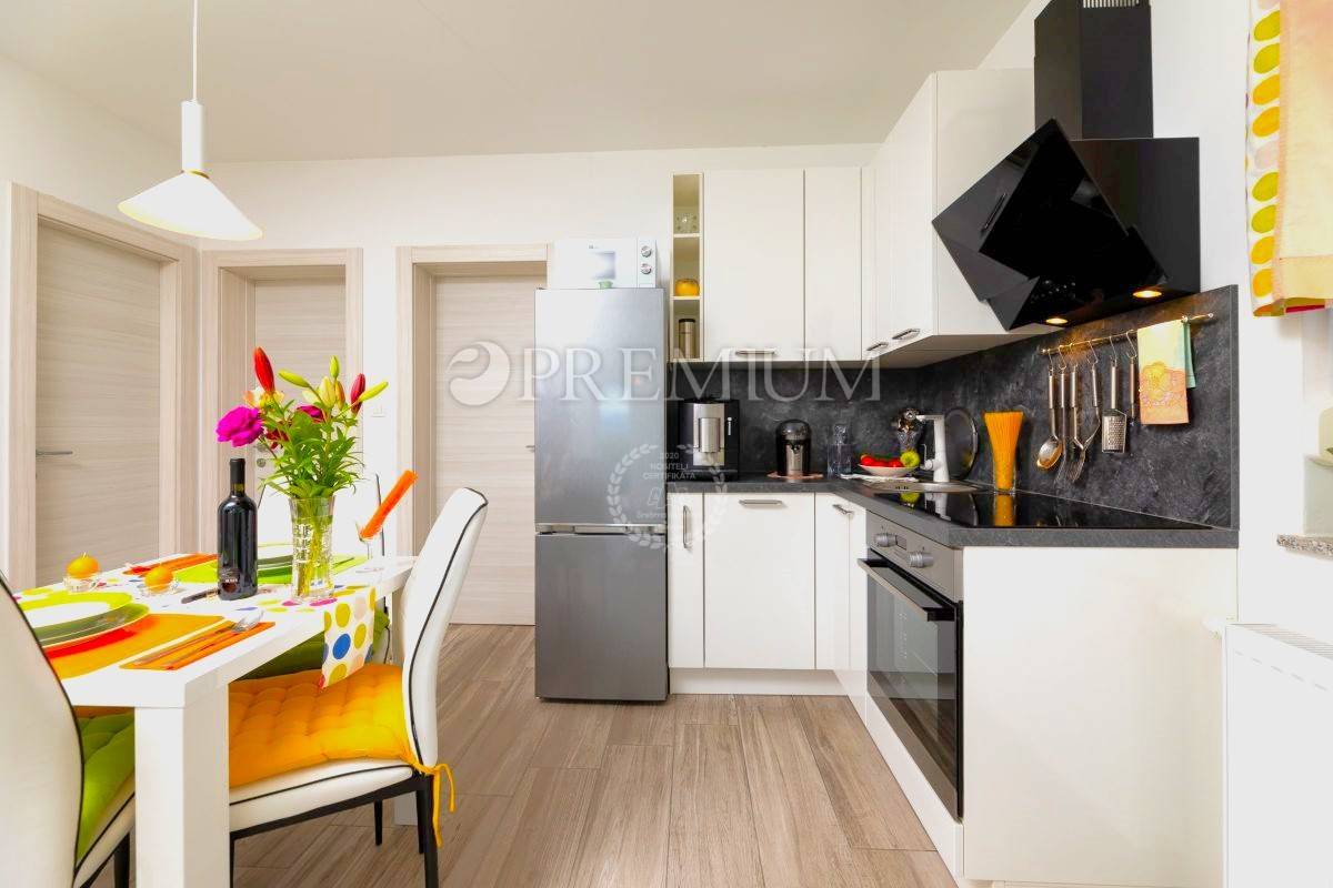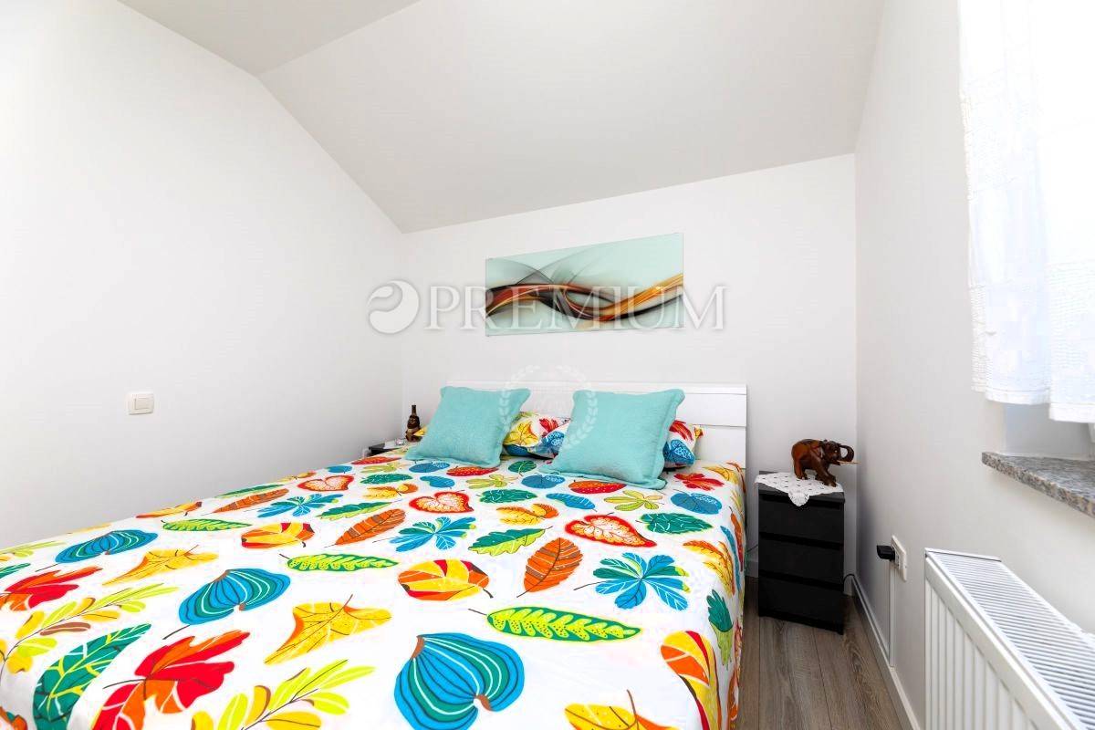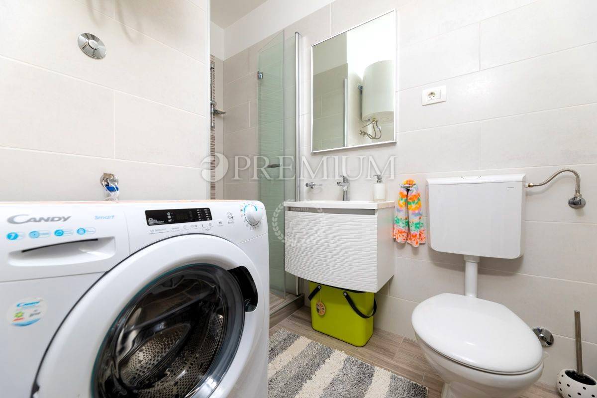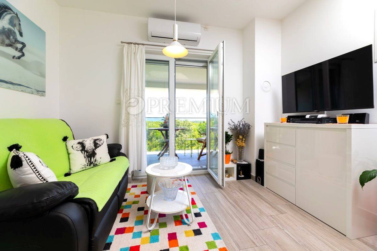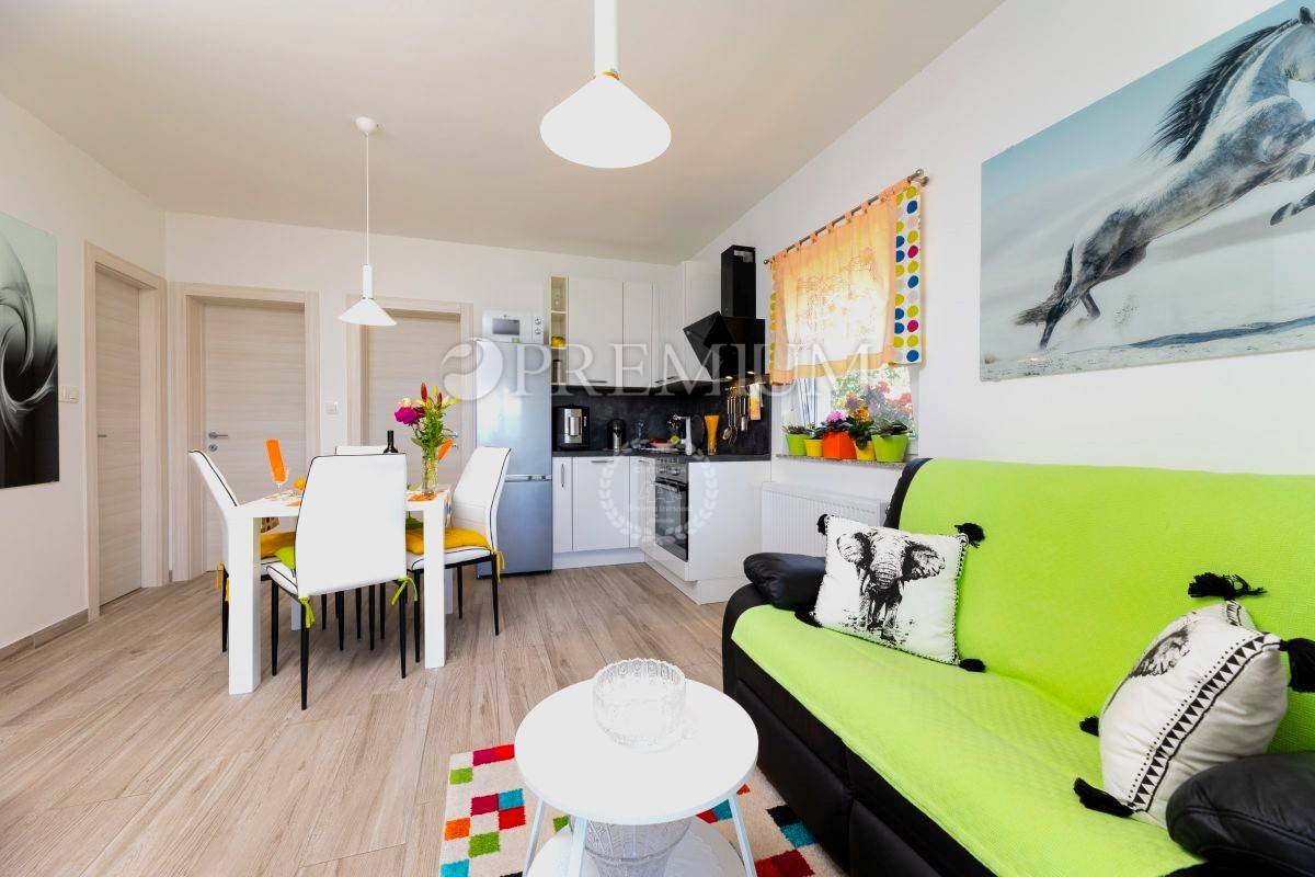 Apartman se sastoji od hodnika, kupaonice, dvije spavaće sobe, dnevnog boravka s kuhinjom i blagovaonicom te terase s pogledom na zelenilo i prirodu. Prodaje se potpuno namješten, a sav namještaj uključen je u cijenu. Stolarija je PVC, energetski razred A, grijanje i hlađenje riješeno je klimom i centralnim sustavom na struju.