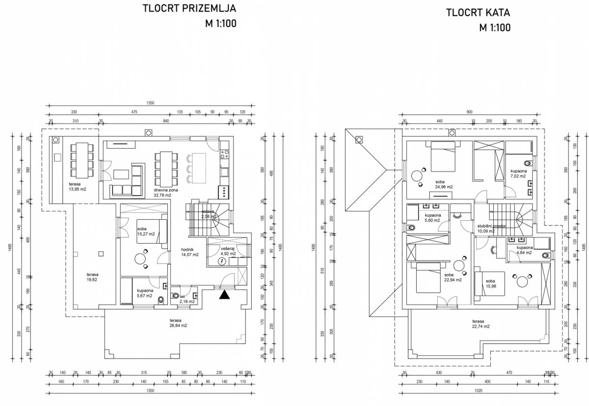 Unutarnjim se stepeništem penjemo na kat. Glavna spavaća soba sadrži vlastitu garderobu te prostranu kupaonicu. Na katu su također još dvije spavaće sobe. Jedna spavaća soba ima vlastitu kupaonicu, a druga vlastitu kupaonicu i garderobu. Iz dvije spavaće sobe izlazi se na prostranu terasu.