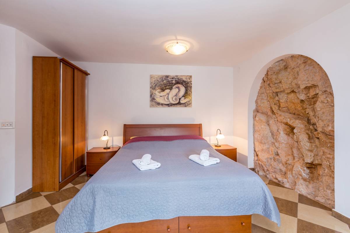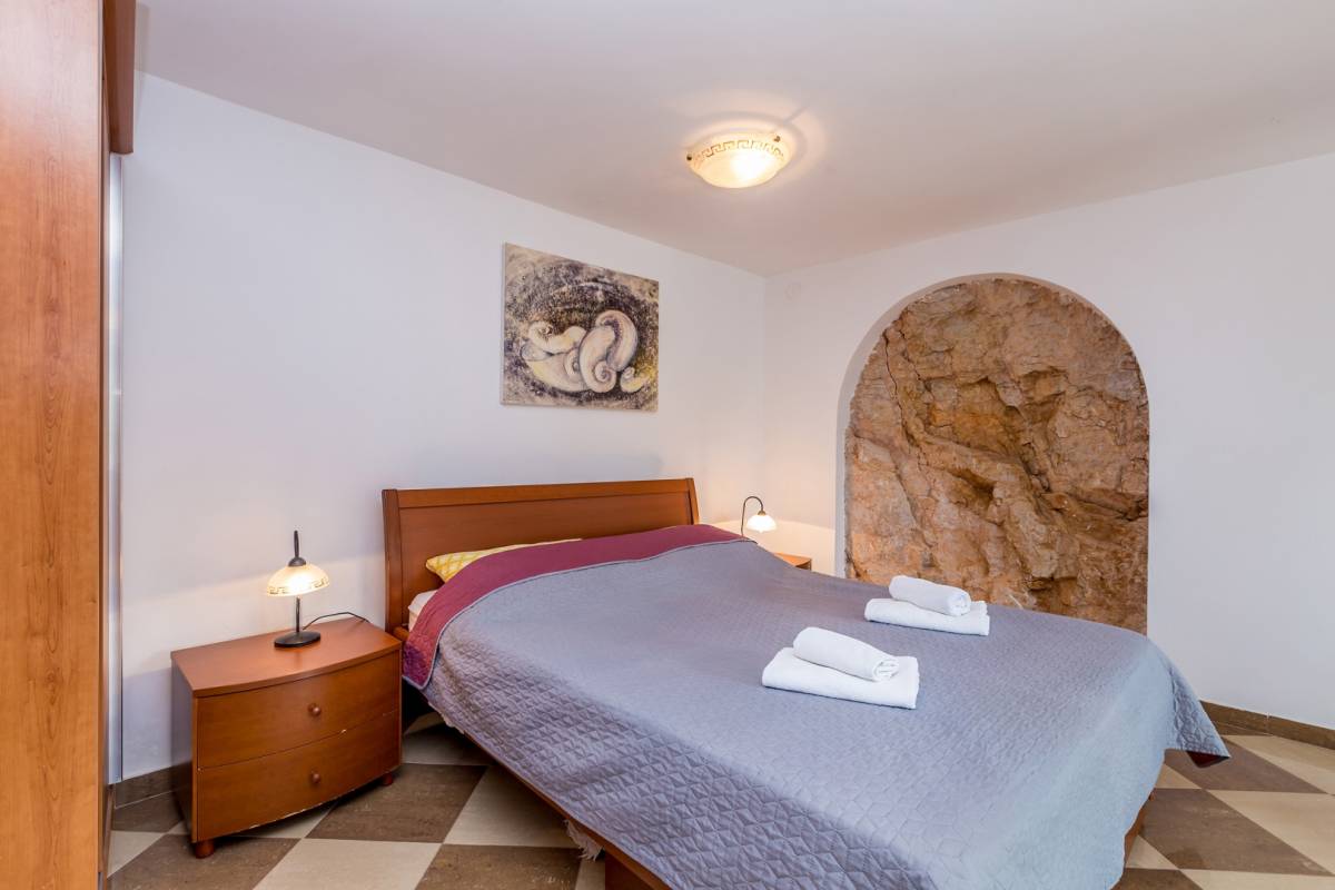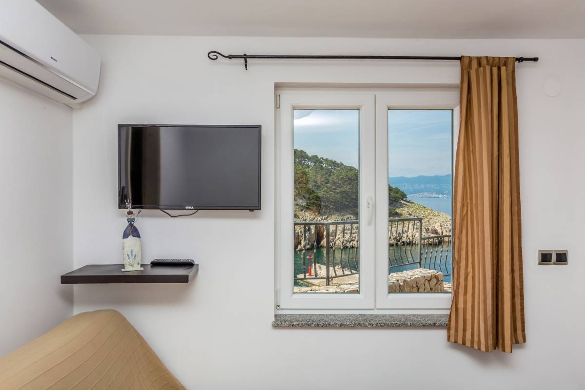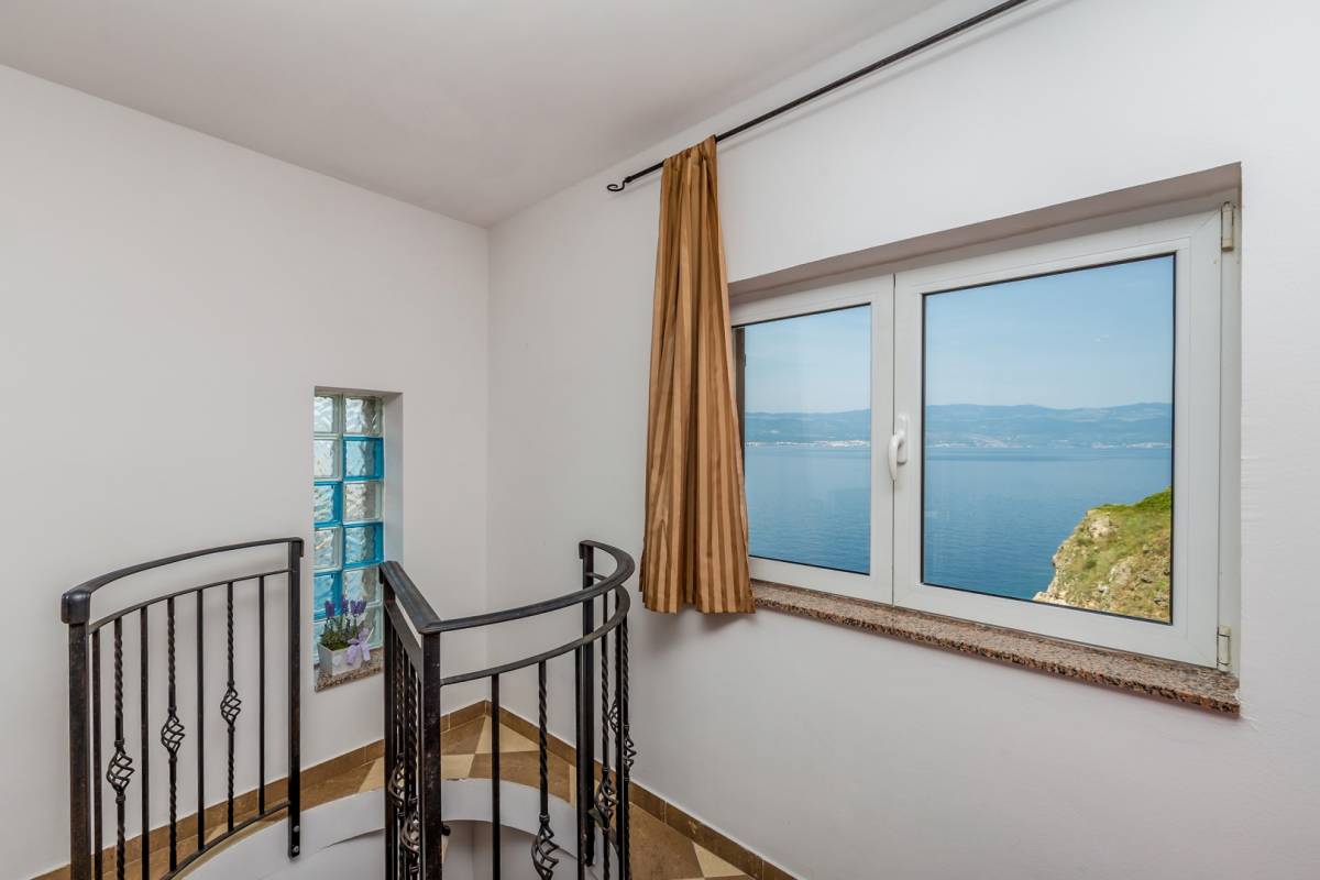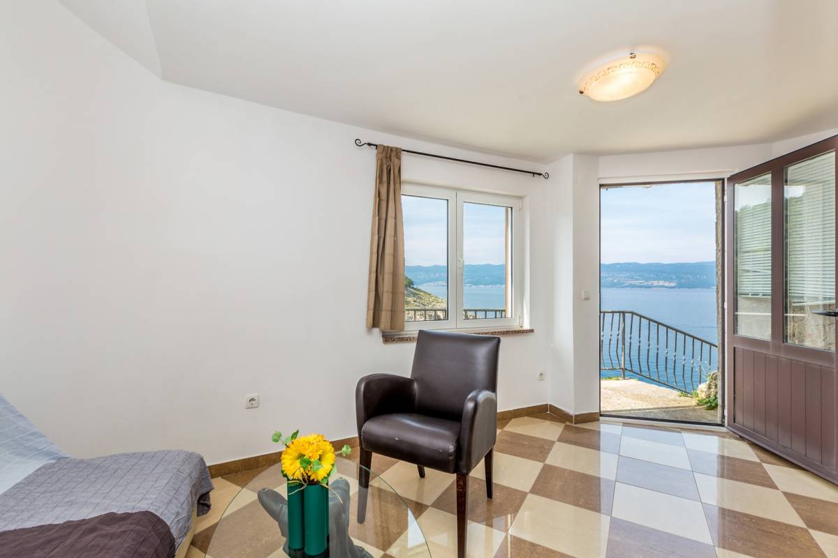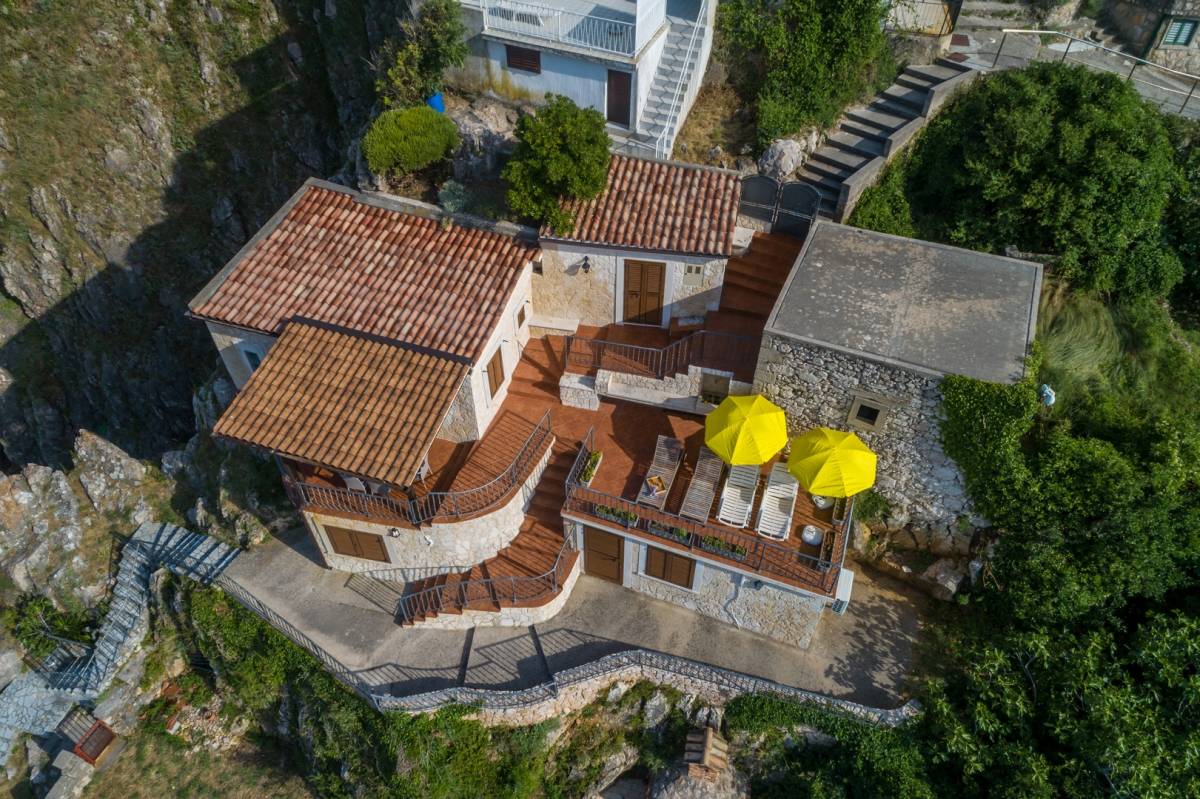 Sastoji se od ukupno tri renovirane kamene kuće, smještene na litici iznad mora, koje funkcioniraju kao jedna cjelina. Kuća ima pristup s dvije strane. S obzirom na poziciju ima odličnu privatnost i otvoreni pogled prema lučici i moru. Dvije kuće su prizemnice i sastoje se od sobe i kupaonice, dok je treća katnica. Na katu se nalazi kuhinja, blagovaonica, dnevni boravak i WC, te izlaz na natkrivenu terasu koja može poslužiti kao ljetna blagovaonica. Prizemlje je povezano unutrašnjim stepeništem, a tamo se nalazi spavaća soba i kupaonica, te izlaz na donju terasu. Taj prostor je moguće prenamjeniti u poseban apartman. Posebnost ovih kuća je prekrasan pogled iz svih prostorija. Na okućnici se nalazi prostor za roštiljanje. Objekt je povezan privatnim stepeništem koje se spušta do mora. Neposredno ispod kuće nalazi se skrivena, šljunčana plaža kojoj je jedini pristup kroz prirodnu spilju. Parkirno mjesto, udaljeno od objekta oko 150 m, moguće je zakupiti od općine.