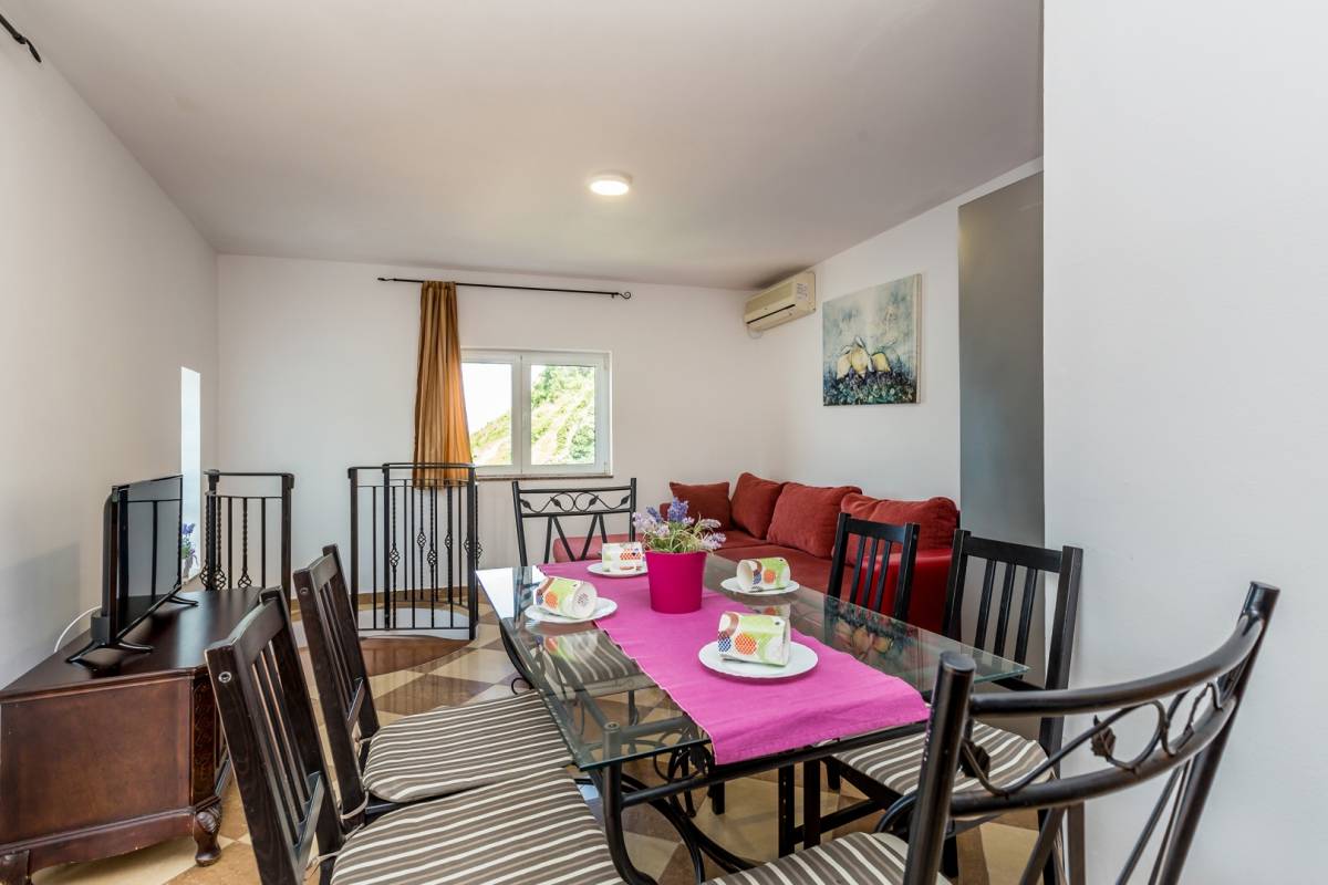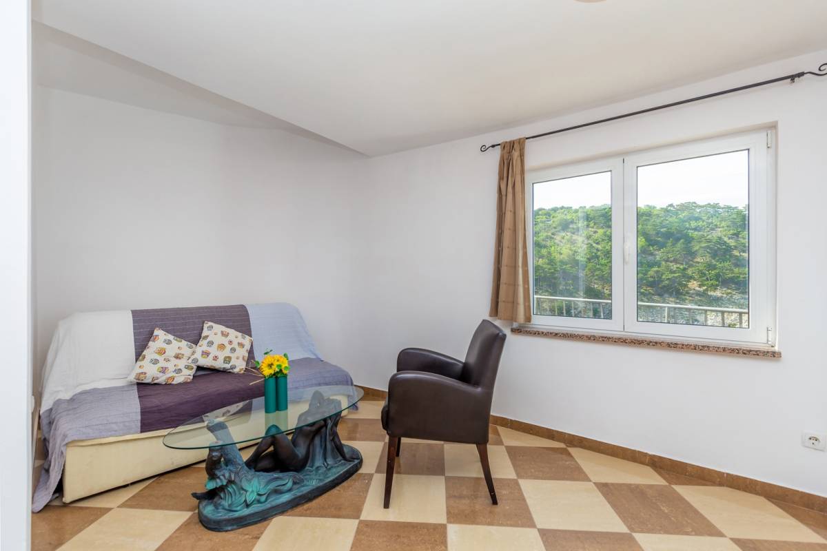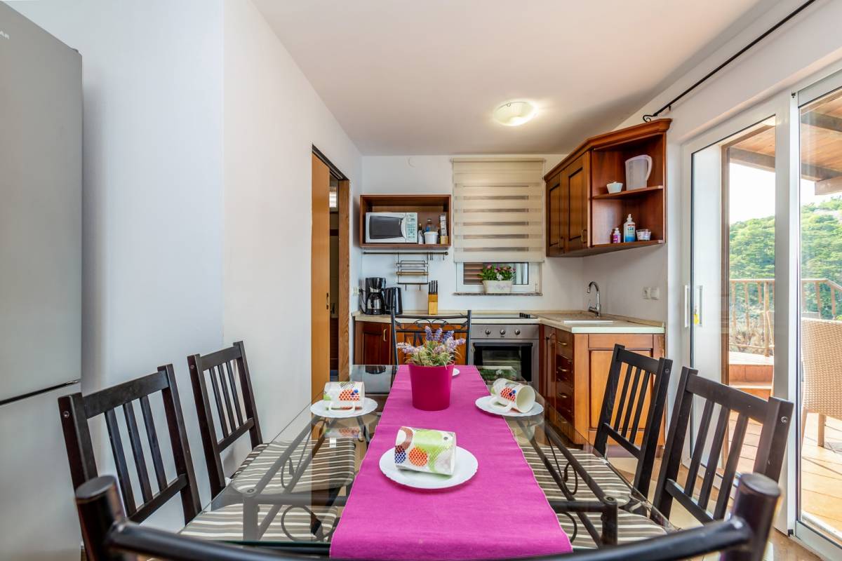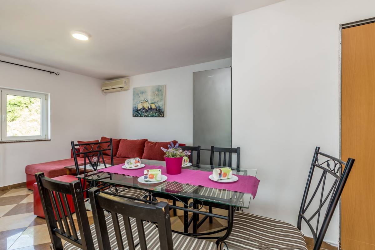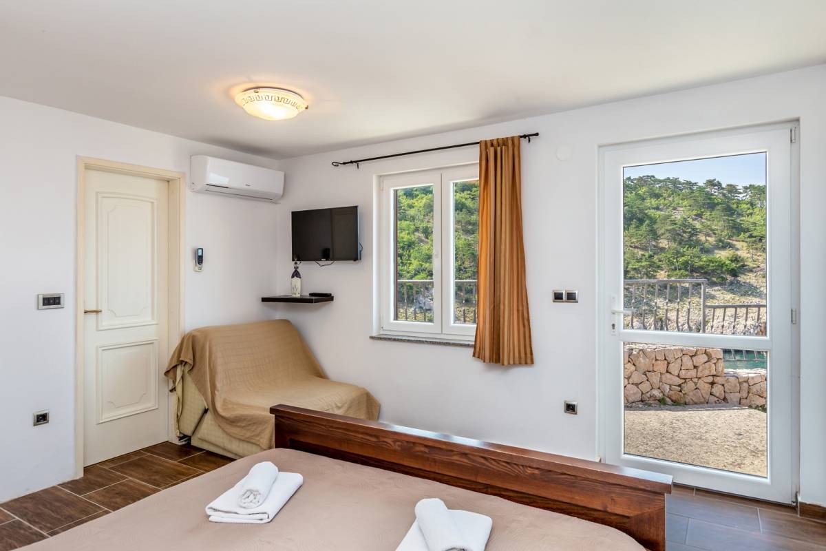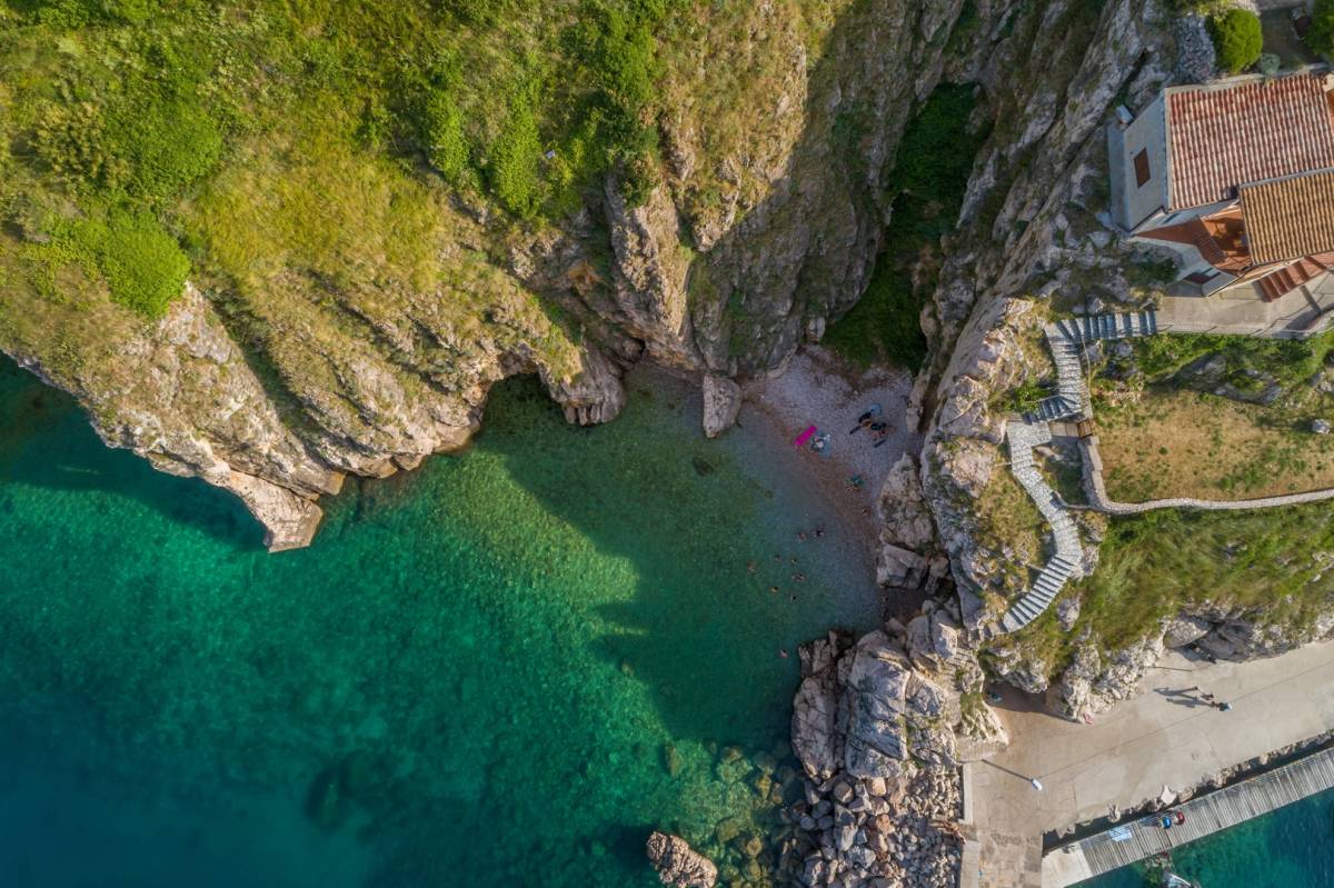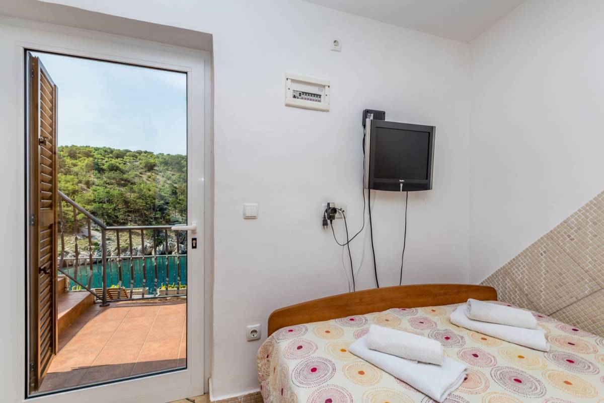 Sastoji se od ukupno tri renovirane kamene kuće, smještene na litici iznad mora, koje funkcioniraju kao jedna cjelina. Kuća ima pristup s dvije strane. S obzirom na poziciju ima odličnu privatnost i otvoreni pogled prema lučici i moru. Dvije kuće su prizemnice i sastoje se od sobe i kupaonice, dok je treća katnica. Na katu se nalazi kuhinja, blagovaonica, dnevni boravak i WC, te izlaz na natkrivenu terasu koja može poslužiti kao ljetna blagovaonica. Prizemlje je povezano unutrašnjim stepeništem, a tamo se nalazi spavaća soba i kupaonica, te izlaz na donju terasu. Taj prostor je moguće prenamjeniti u poseban apartman. Posebnost ovih kuća je prekrasan pogled iz svih prostorija. Na okućnici se nalazi prostor za roštiljanje. Objekt je povezan privatnim stepeništem koje se spušta do mora. Neposredno ispod kuće nalazi se skrivena, šljunčana plaža kojoj je jedini pristup kroz prirodnu spilju. Parkirno mjesto, udaljeno od objekta oko 150 m, moguće je zakupiti od općine.