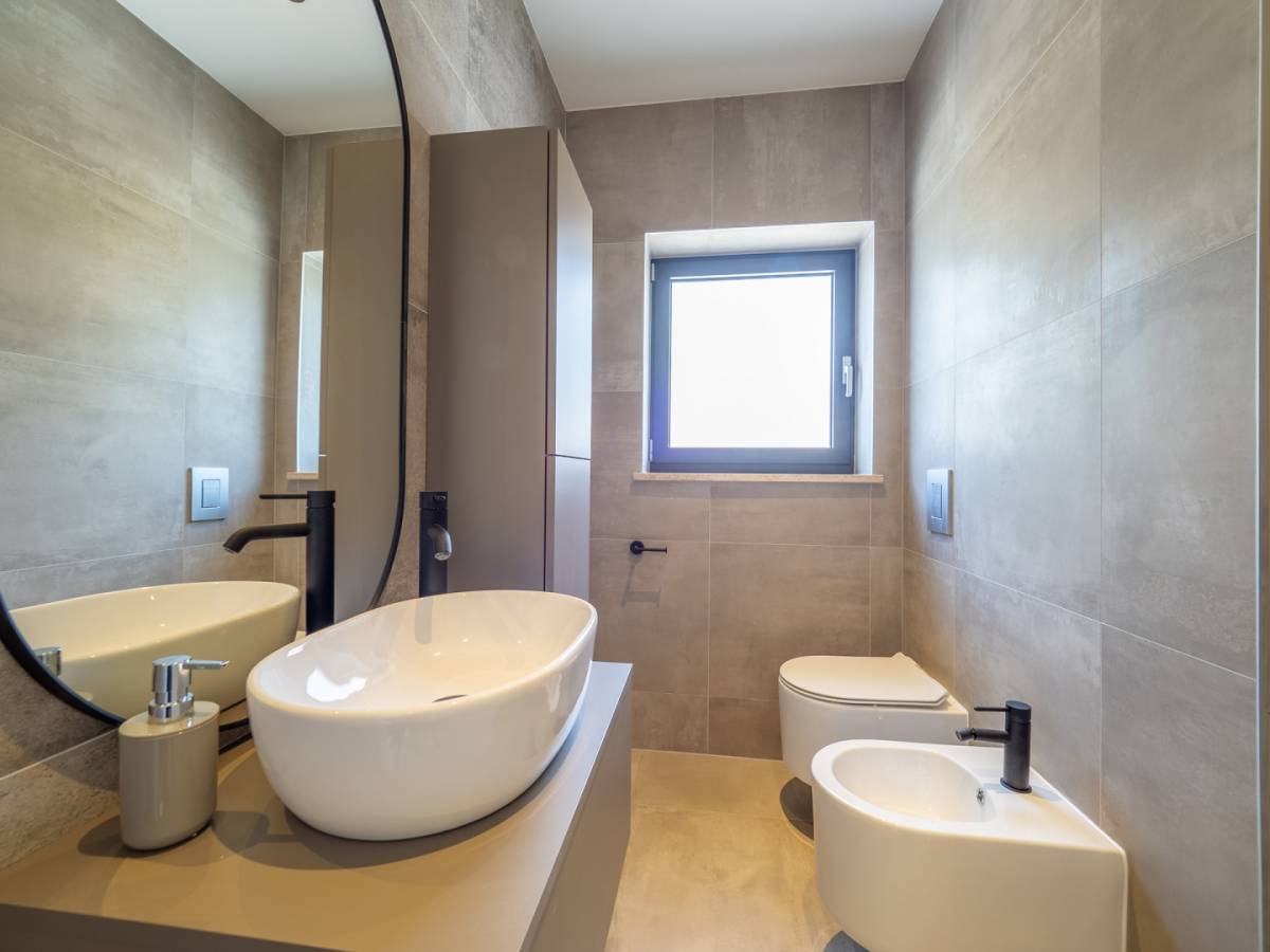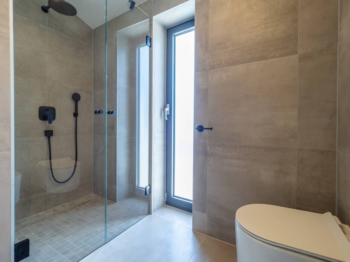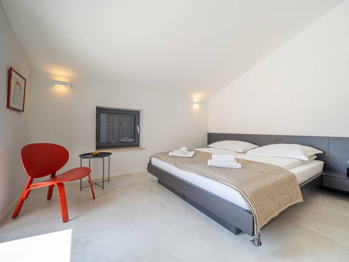 Na katu su tri moderno uređene spavaće sobe, svaka s vlastitom kupaonicom. Dvije sobe imaju izlaz na natkrivenu terasu od 15 m², dok treća vodi na loggiu od 3 m² s pogledom na more.