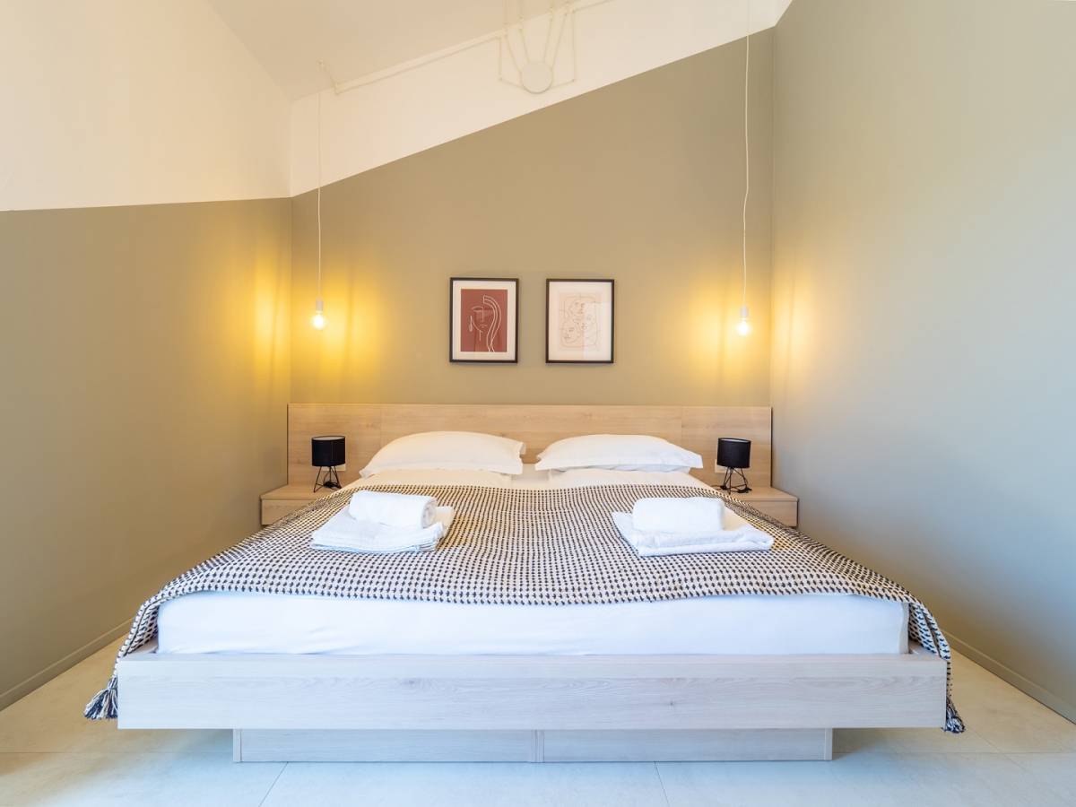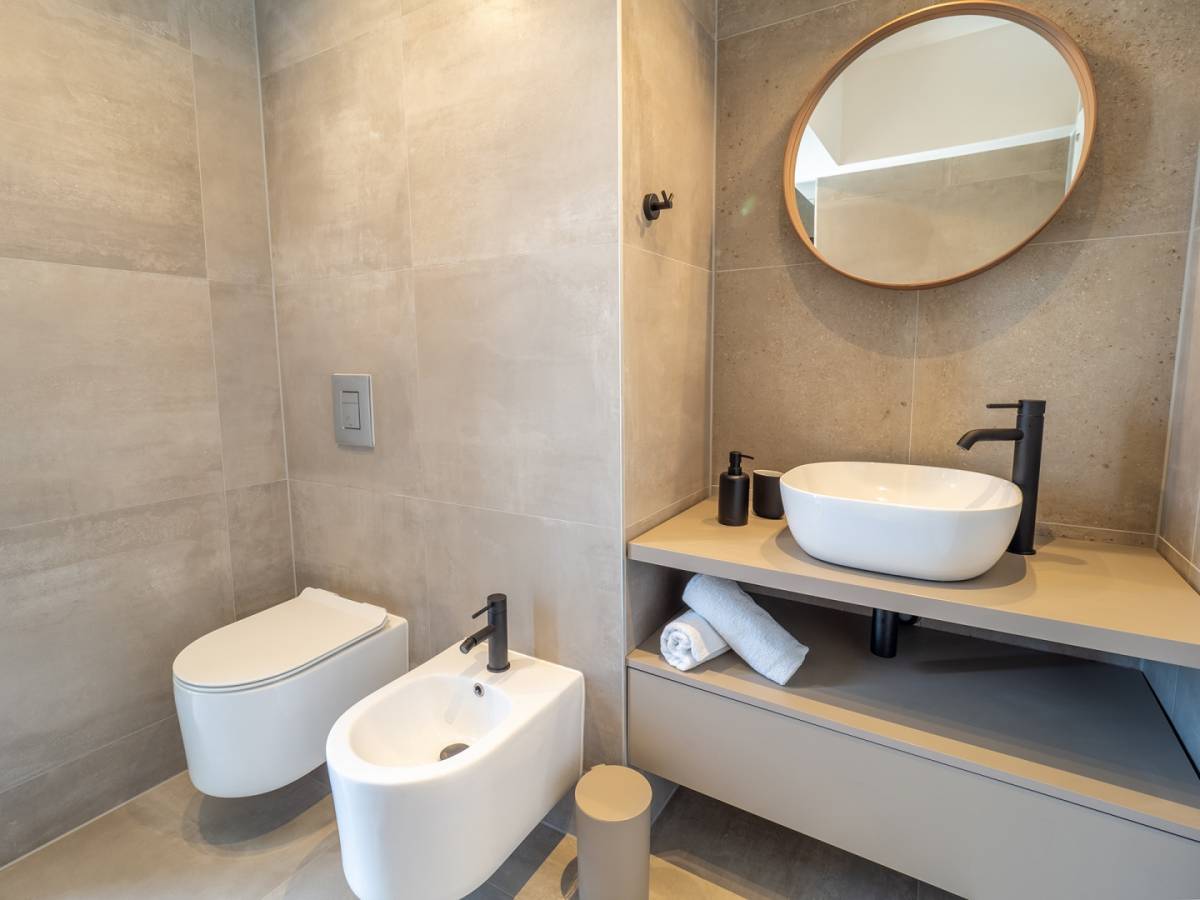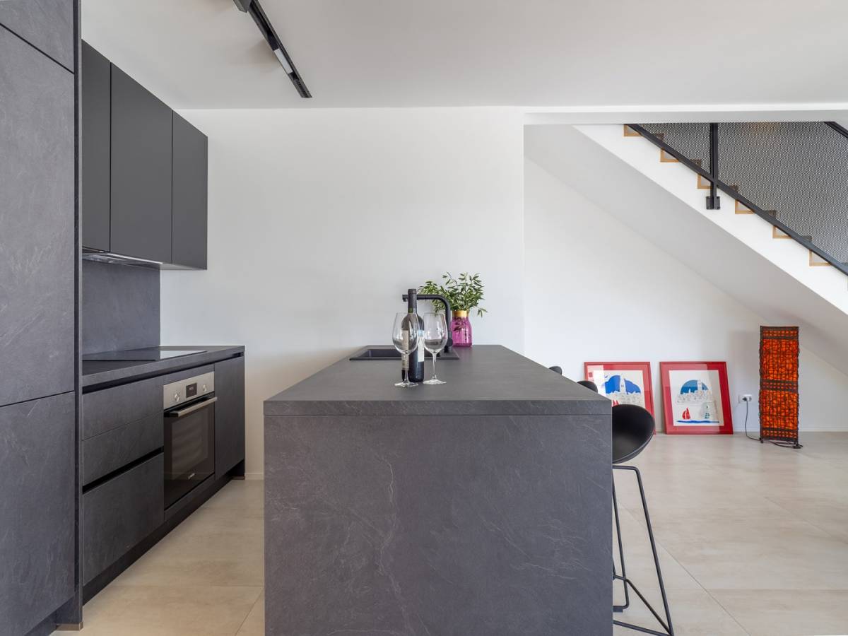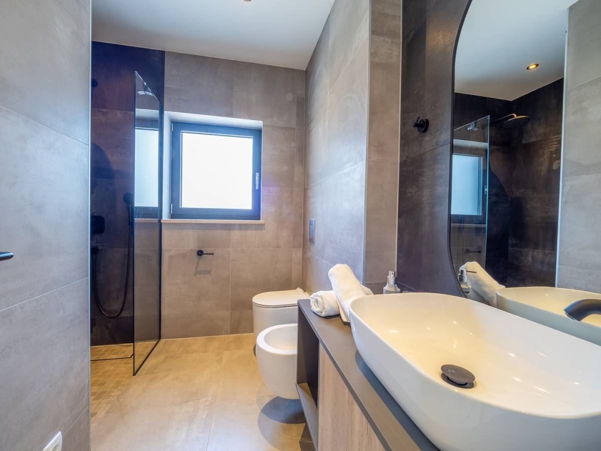 Na katu su tri moderno uređene spavaće sobe, svaka s vlastitom kupaonicom. Dvije sobe imaju izlaz na natkrivenu terasu od 15 m², dok treća vodi na loggiu od 3 m² s pogledom na more.