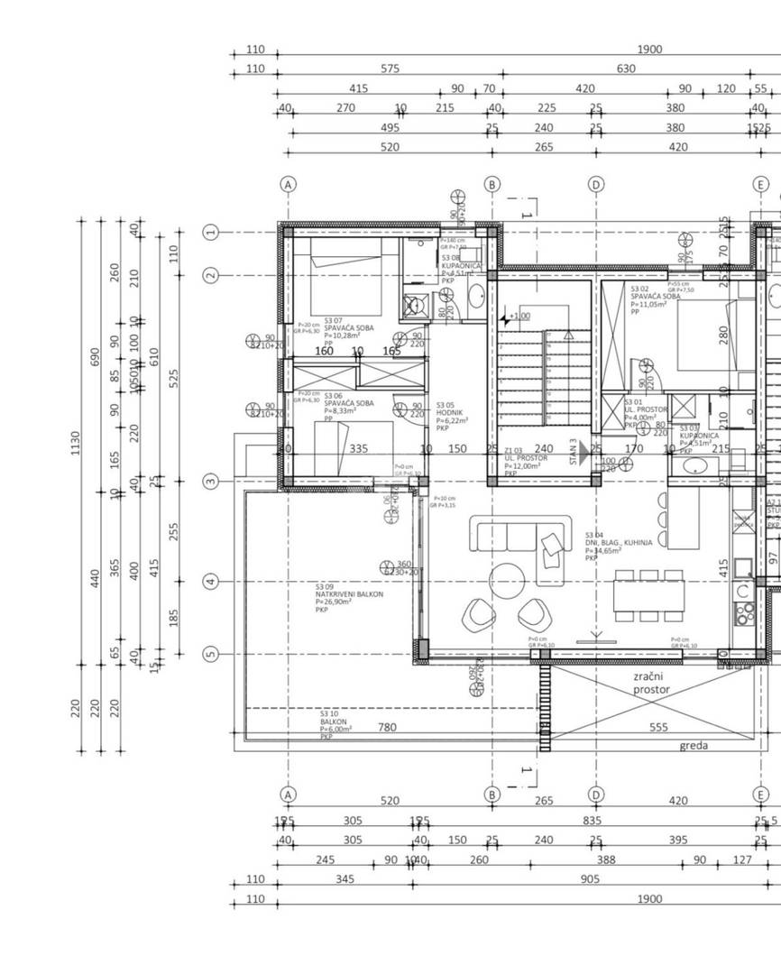 Stambeni prostor 116,32m2 + Terasa 27 m2 + 2 Parkinga ukupno 141,57m2.