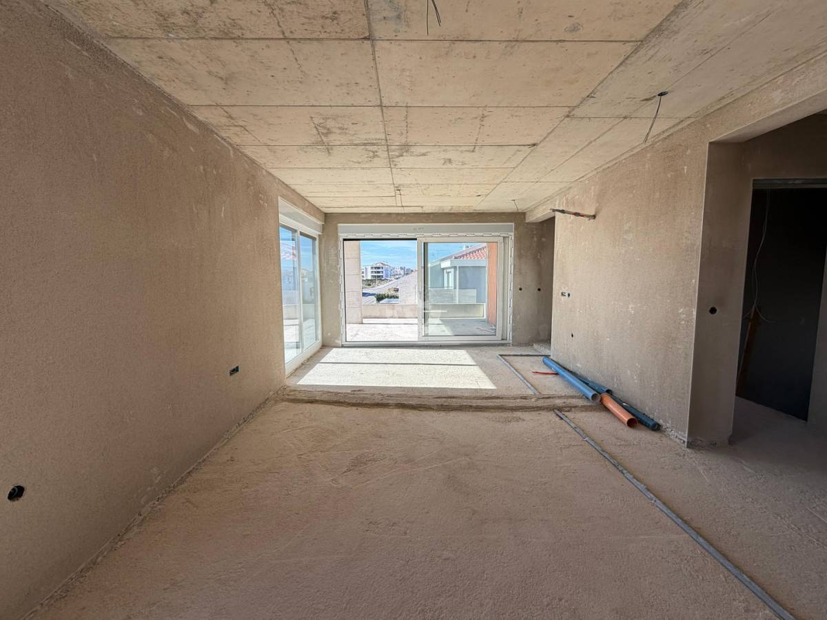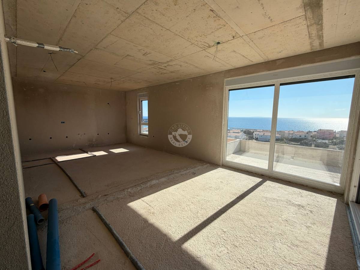 Stan nudi 3 spavaće sobe i 2 kupaonice, te prostrani open-space dnevni boravak s kuhinjom i blagovaonicom ispunjen prirodnim svjetlom. Poseban naglasak je na natkrivenoj terasi od 27 m2 koja pruža idealan prostor za opuštanje i uživanje u mediteranskoj atmosferi i pogledu na more. Lift je u zgradi.