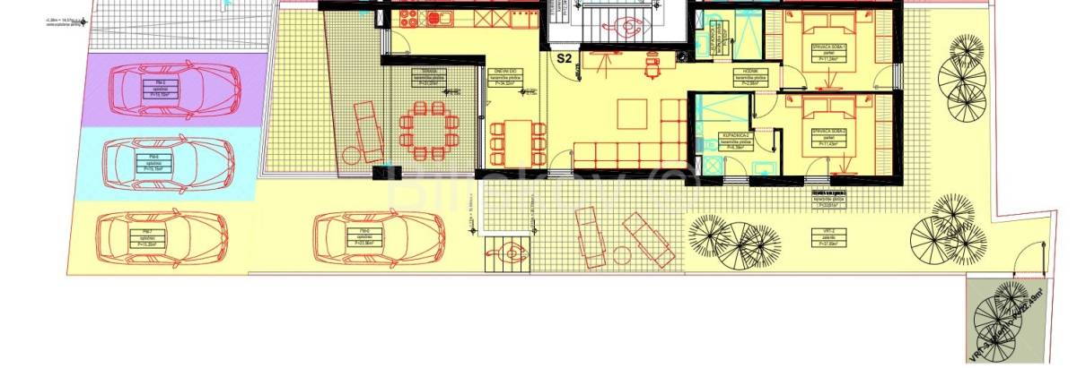 parkirna mjesta su veličine 15 M2 sa ugrađenim punionicama za električna vozila koja su unaprijed prespojena na brojilo svakog stana,