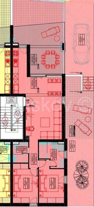 Prekrasan 3 sobni stan ukupne površine 214,77 m2 u luksuznoj novogradnji, građenoj prema najnovijim zahtjevima NZEB-a ( near zero emission building). Sam stan je površine 107,55 m2. Ostala kvadratura otpada na veliku terasu, okućnicu (cca 70m2) i spremište. Stanu pripadaju i 2 parkirna mjesta. Sjajno iskorišten prostor sastoji se od: velikog dnevnog boravka integriranog sa kuhinjom i blagovaonicom koji izlazi na balkon, a potom i na terasu, dvije spavaće sobe od kojih svaka ima kupaonicu „en suite“. Velika staklena vrata zatvaraju dnevni boravak prema balkonu i terasi, pa iz dnevnog boravka „ puca“ pogled na prekrasno plavo more. Zgrada je opremljena visoko kvalitetnom opremom prema zahtjevima NZEB standarda, što jamči visoku energetsku učinkovitosti niske utroške energenata: