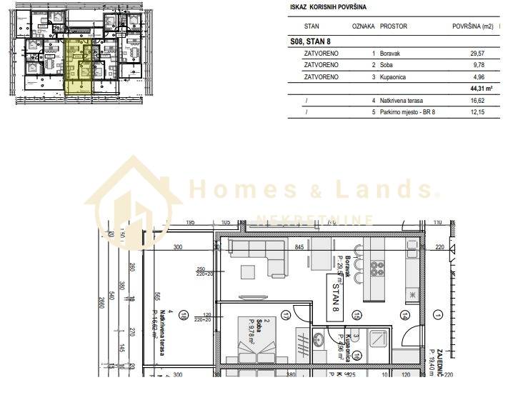 Stan oznake S8 obračunske površine 55,74m2 na 2 katu s terasom i vanjskim parkingom, sastoji se od ulaznog hodnika,kuhinje s blagovaonicom,dnevnog boravka,spavaće sobe,kupaonice,natrkriene terase i vanjskog parkinga.