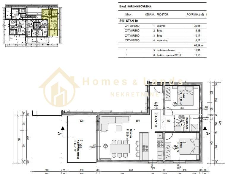 Stan oznake S10 obračunske površine 70,31m2 na 2 katu s terasom i vanjskim parkingom, sastoji se od ulaznog hodnika,kuhinje s blagovaonicom,dnevnog boravka, dvije spavaće sobe,kupaonice,nadkrivene terase i vanjskog parkinga.