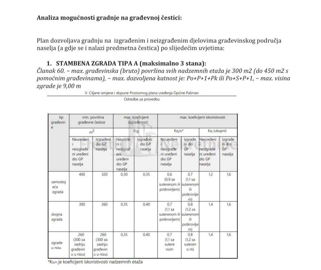 Prema Prostornom planu uređenja Općine Pašman moguća je gradnja stambene zgrade sa maksimalno tri ili četiri stana uz određene uvjete ( dokumentacija dostupna na uvid u agenciji), maksimalna dozvoljena katnost je Po + P + 1 + PK ili Po + S + P + 1, maksimalna visina zgrade je 9,00 metara.