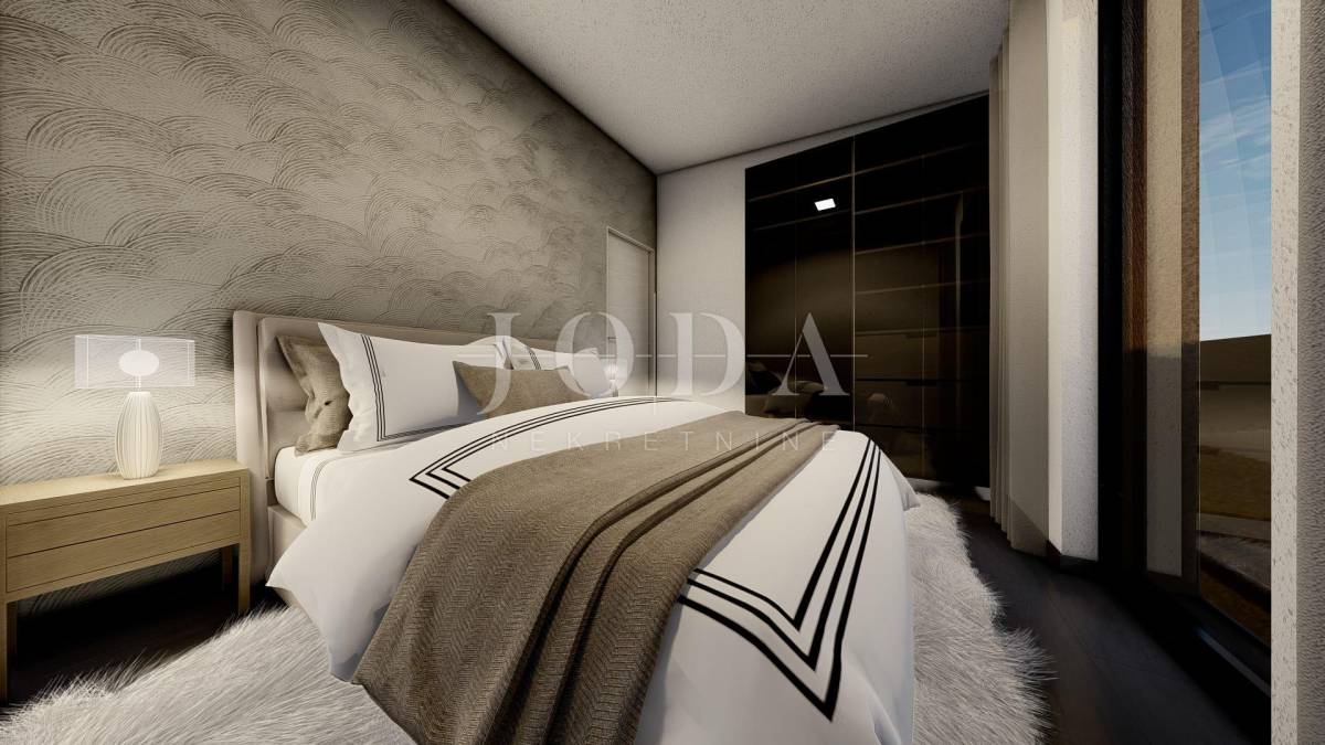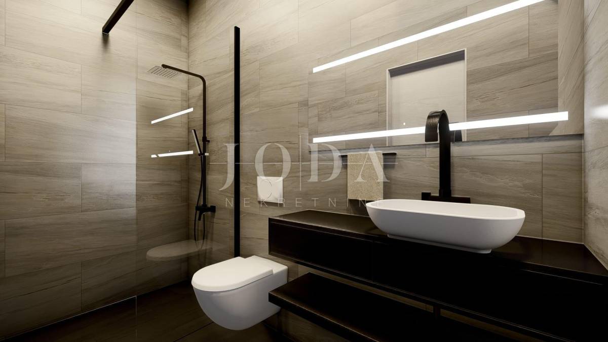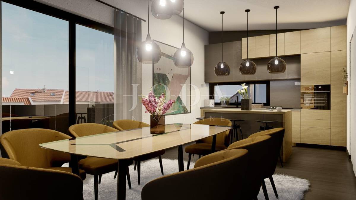 Penthouse se nalazi na drugom katu manje stambene zgrade. Površina unutarnjeg prostora je 97,68 m2, a terasa 51,68 m2. Sastoji se od hodnika, dnevnog boravka, kuhinje s blagovaonicom, tri spavaće sobe, dvije kupaonice, ostave i tri terase. Dnevni boravak i jedna spavaća soba imaju izlaz na terasu površine 15 m2, a kuhinja i blagovaonica na terasu površine 37,50 m2. Ima dva parkirna mjesta.