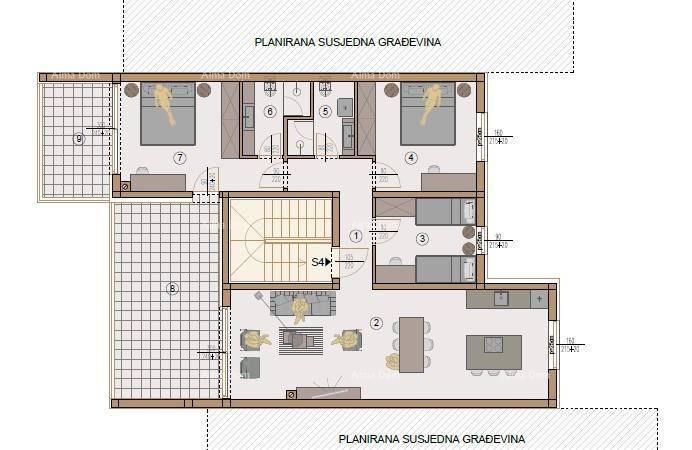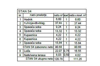 U ponudi je stan S4, smješten na 2.katu Zgrade 3 ima površinu 111,25 m² (90,68 m² zatvorenog prostora), s tri spavaće sobe (9,24 m², 13,32 m², 15,64 m²), dvije kupaonice, velikom dnevnom zonom (37,44 m²), hodnikom, lođom (22,07 m²) i natkrivenom terasom (8,03 m²). Ovaj stan nudi komfor i pogled koji savršeno upotpunjuje dojam modernog doma.