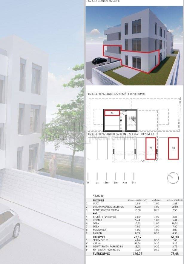 Apartman "B1" je dvosoban dvoetažan stan sa pripadajućim vrtom, spremištem u podrumu te dva parkirna mjesta. Površina zatvorenog dijela stana bez balkona, terase i pripadaka iznosi 54,44 m2, a sastoji se od :