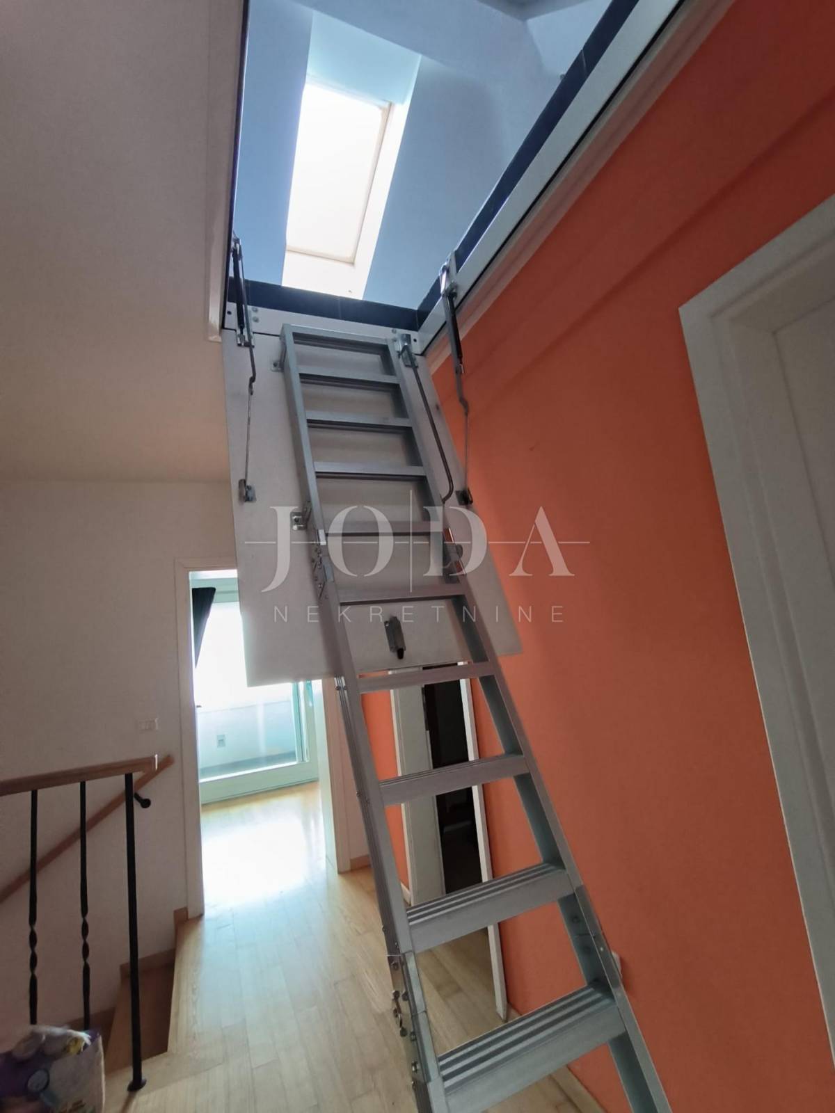 ▪ Kat ukupne površine 125 m2; tri spavaće sobe, kupaonica sa saunom i walk in ormarom, hodnik, dvije terase od kojih je jedna natkrivena, a druga kompletno zatvorena stolarijom. Iz hodnika se pristupa uređenom potkrovlju koje se koristi kao spremište. Gornji kat je mostićem povezan sa prostranom stražnjom okućnicom. Kaskadni vrtovi koji imaju sustav navodnjavanja i provedenu struju za rasvjetu, te kućicu za alat.