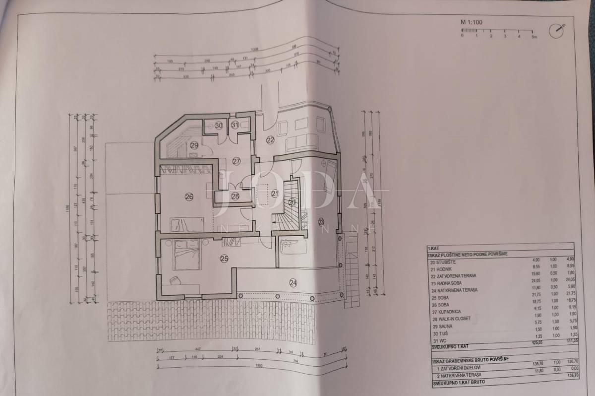 Kuća ukupne površine 369 m2 smještena na parceli od 878 m2, proteže se na tri etaže ( suteren, prizemlje i kat ), sastoji se od: