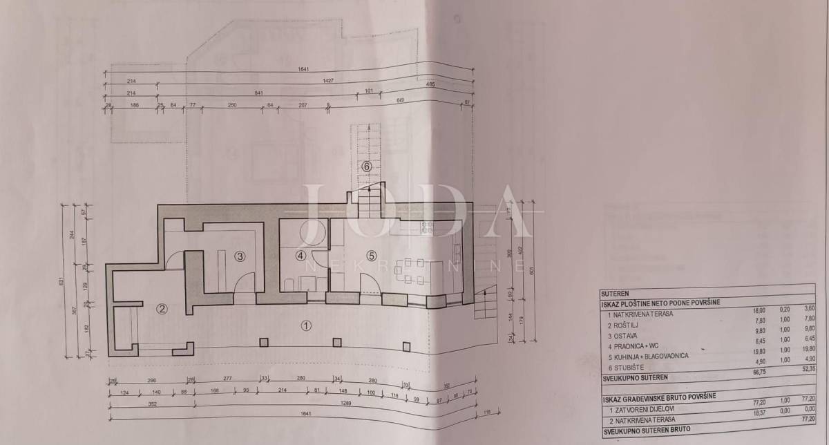 ▪ Suteren ukupne površine 66 m2; vinska konoba sa kuhinjom i blagovaonom, spremište, toalet, kotlovnica, natkriveni roštilj i dvije terase.