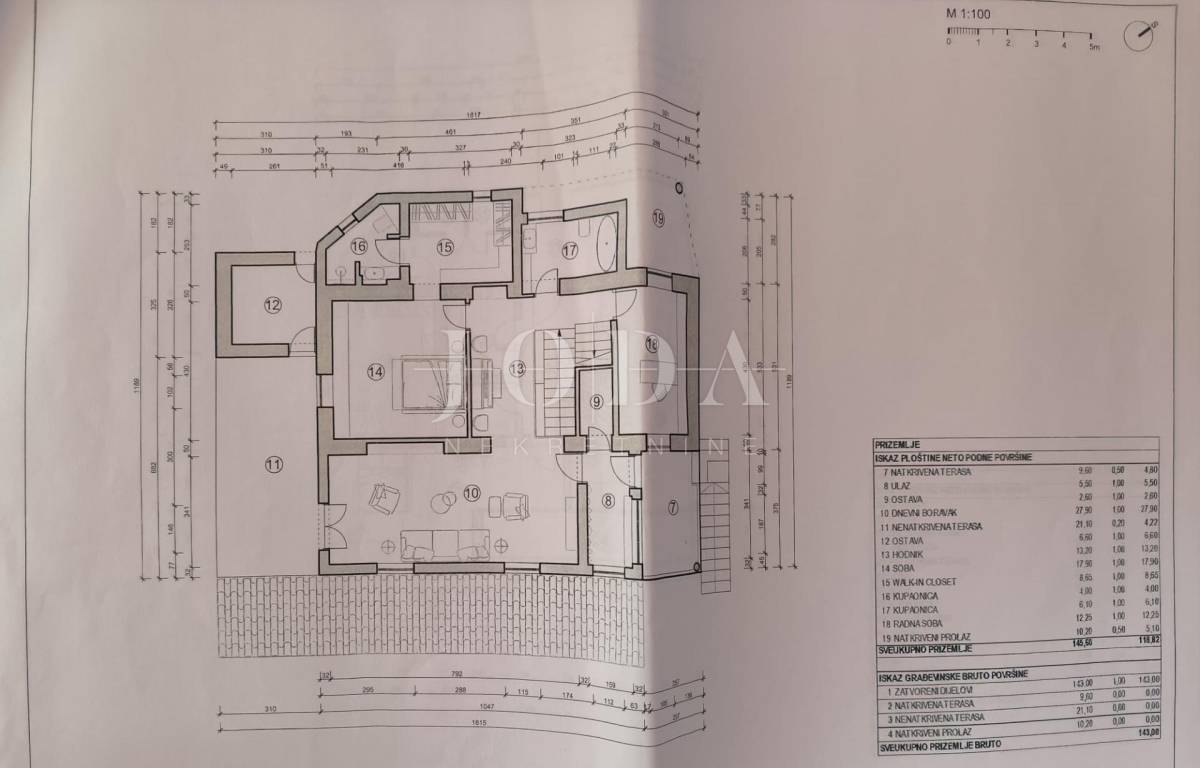 ▪ Prizemlje ukupne površine 145 m2; dnevni boravak, spavaća soba s walk in ormarom i kupaonom, radna soba, hodnik, stubište, druga soba sa kupaonom, ostava i dvije terase.