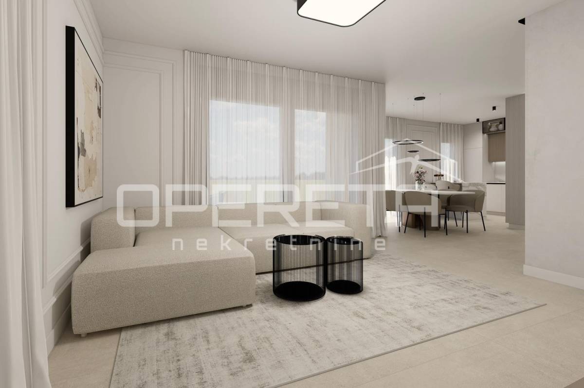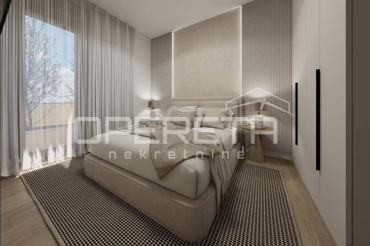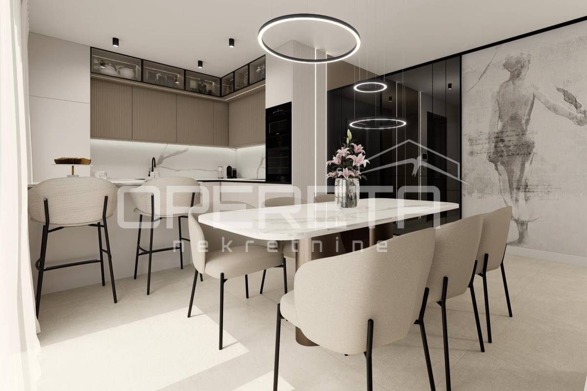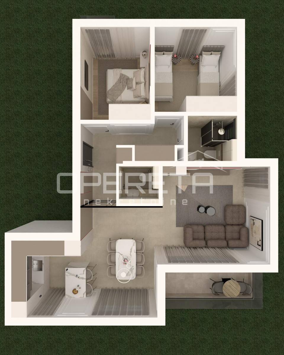 Stan se odlikuje promišljenim rasporedom koji spaja udobnost i suvremeni dizajn. Dnevni boravak, kuhinja i blagovaonica čine otvoreni i svijetli prostor ispunjen prirodnim svjetlom, dok spavaća soba i dodatna soba pružaju mir i intimu potrebnu za svakodnevni odmor. Interijer prirodno vodi prema balkonu, omogućujući osjećaj povezanosti s vanjskim prostorom i mediteranskim načinom života.