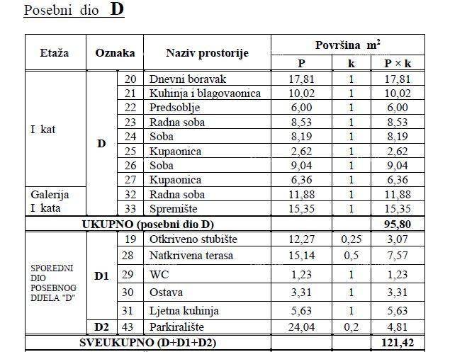 Ukupna obračunska površina stana sa svim pripadajućim dijelovima iznosi 121,42 m².