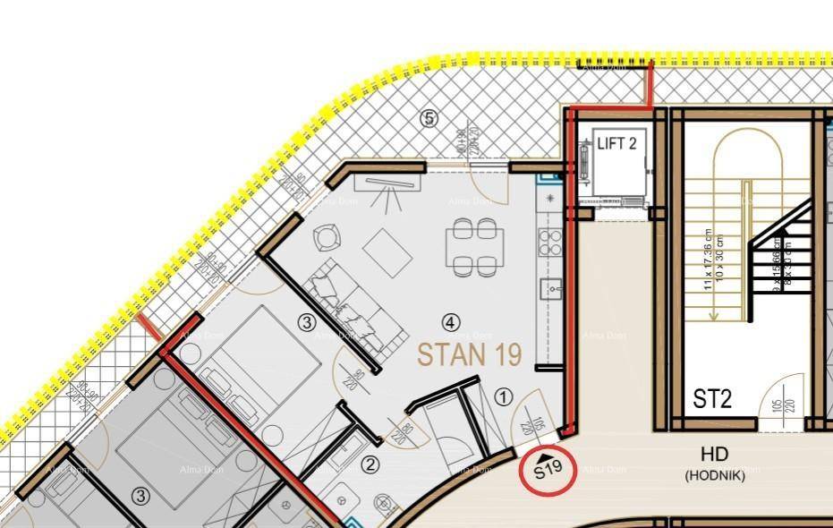 Stan S19 nalazi se na prvom katu i sastoji se od hodnika s garderobom, kupaonice, spavaće sobe, dnevnog boravka s kuhinjom i blagovaonicom te loggie.